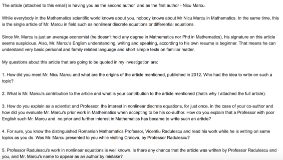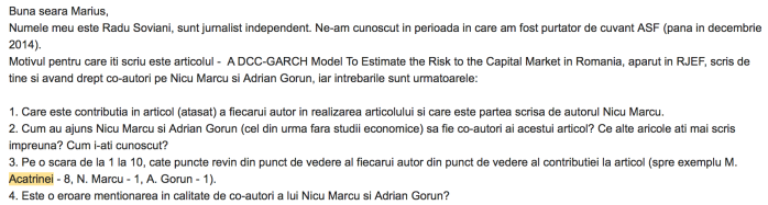Dacă profesorul Bisci mi-a răspuns la email în 3 ore de la momentul adresării întrebărilor, autorul acestui al doilea articol furat/folosit de Nicu Marcu pentru a ajunge doctor honoris causa, Marius Cristian Acatrinei, nu mi-a răpsuns nici după 6 săptămâni.