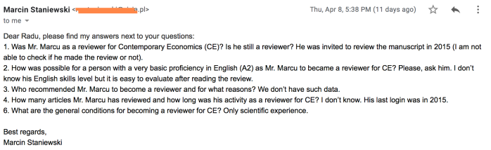 c) Singura publicație care mi-a răspuns este Contemporary economics, din Polonia, unde Nicu Marcu a pretins că a recenzat mai multe articole: ,,recenzor articole”. Pe scurt, revista nu poate veifica dacă a făcut vreo recenzie în urma unei invitații din 2015, pe care nu știe cine a făcut-o. Revista nu poate verifica nici nivelului calității vreunei recenzii în limba engleză (și nici dacă vreun eventual recenzat a fost publicat), întrucât nu dispune de vreo recenzie făcută de Nicu Marcu. Ultima logare (și singura? probabil la înregistrare?) este din 2015. O (singura) logare esențială pentru Nicu Marcu în ceea ce privește evaluării activității de ,,conducător de doctorat”, și, începând cu 2016, de Director al Școlii Doctorale Economie II de la ASE: