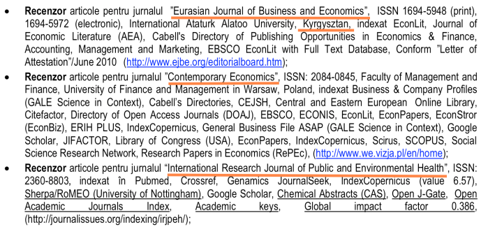 b) Am încercat verificarea dobândirii calității de recenzor (invocată de Marcu pentru dobândirea titlurilor) și pentru Eurasian Journal of Business and Economics din Kyrgystan. Întrebările mele despre Letter of Atestation din 2010 pentru Nicu Marcu (când nu știa limba engleză și când încă plagia articole pentru a deveni conferențiar universitar), au rămas fără răspuns;