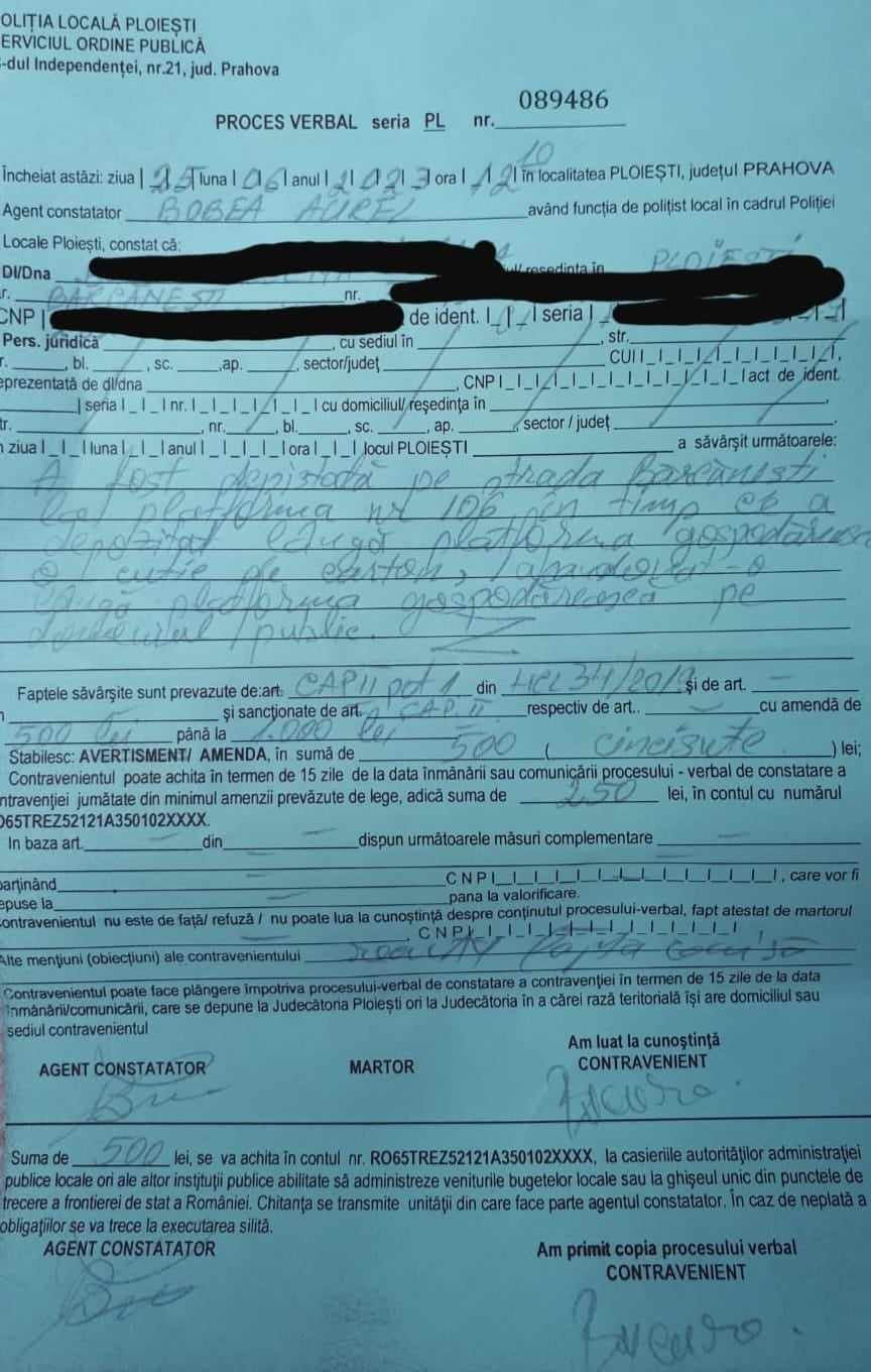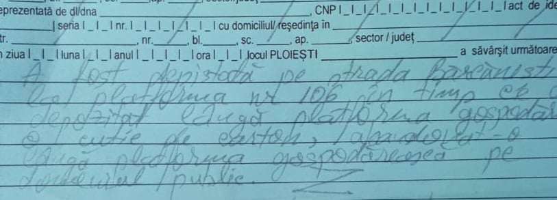 Agentul tau (un alt analfabet functional) NU a completat exact data comiterii presupusei fapte, exact ce atrage NULITATEA ABSOLUTA. Nu te uita ca procesul – verbal a fost intocmit la data de….ci la ce presupune intocmirea corecta a unui proces – verbal, adica la mentiunea cand fapta a fost comisa. Nu ne-ar mira ca sa fie modificate in fals cele copiile procesului – verbal de contraventie, dar – ATRAGEM ATENTIA – in modul cel mai serios ca procesul-verbal publicat de Observatorul Prahovean (exemplarul rosu) va constitui proba la o evantuala falsificare a celorlalte doua copii!).