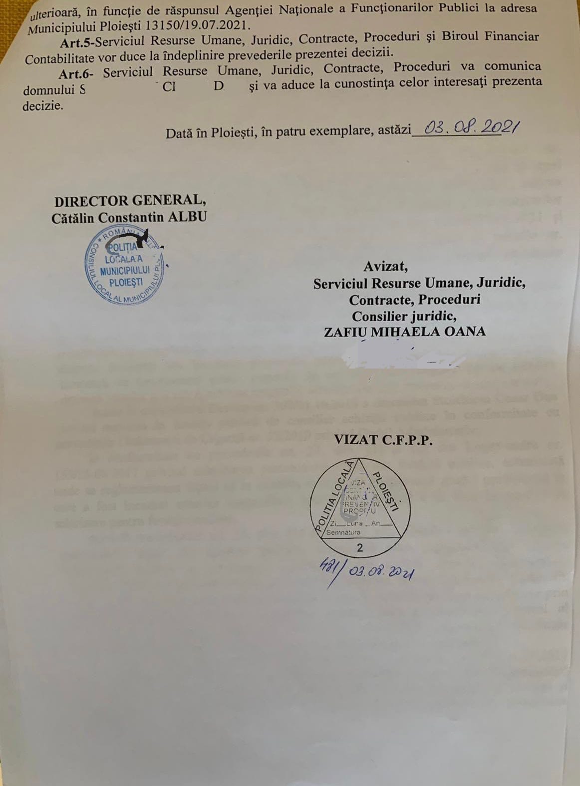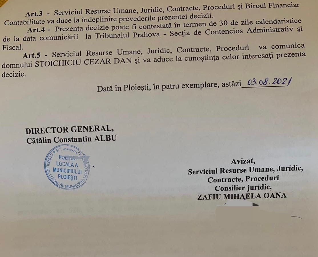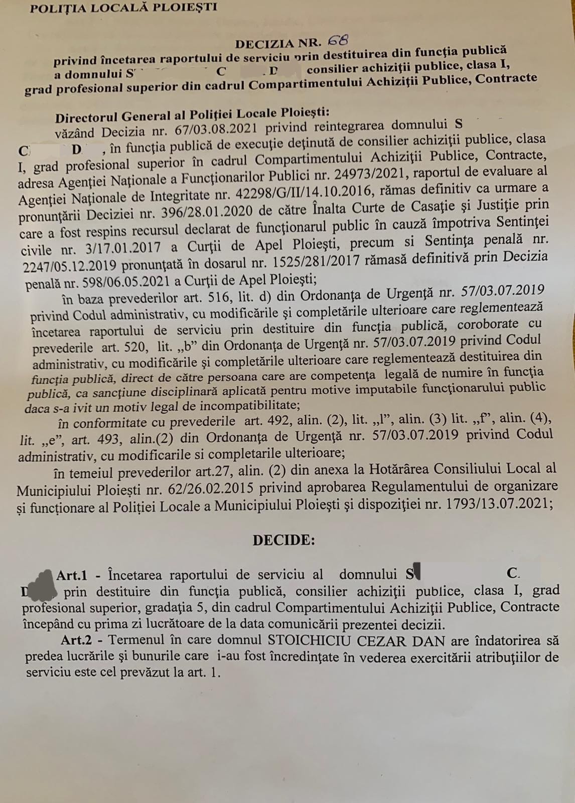 Pe scurt, Politia Locala Ploiesti dupa ce a emis decizia nr 67 prin care S.C.D este reangajat conform deciziei definitive ale instantei cu plata salariilor pe o perioada de peste 5 ani de zile, trebuia să il introduca în comisia de disciplină pe S.C.D in baza adreselor de la Agenția Națională de Integritate și Agenția Națională a Funcționarilor Publici .Faza pe aroganta si incompetenta ale tractoristului care a plecat de tot la ARAT, in afara legii