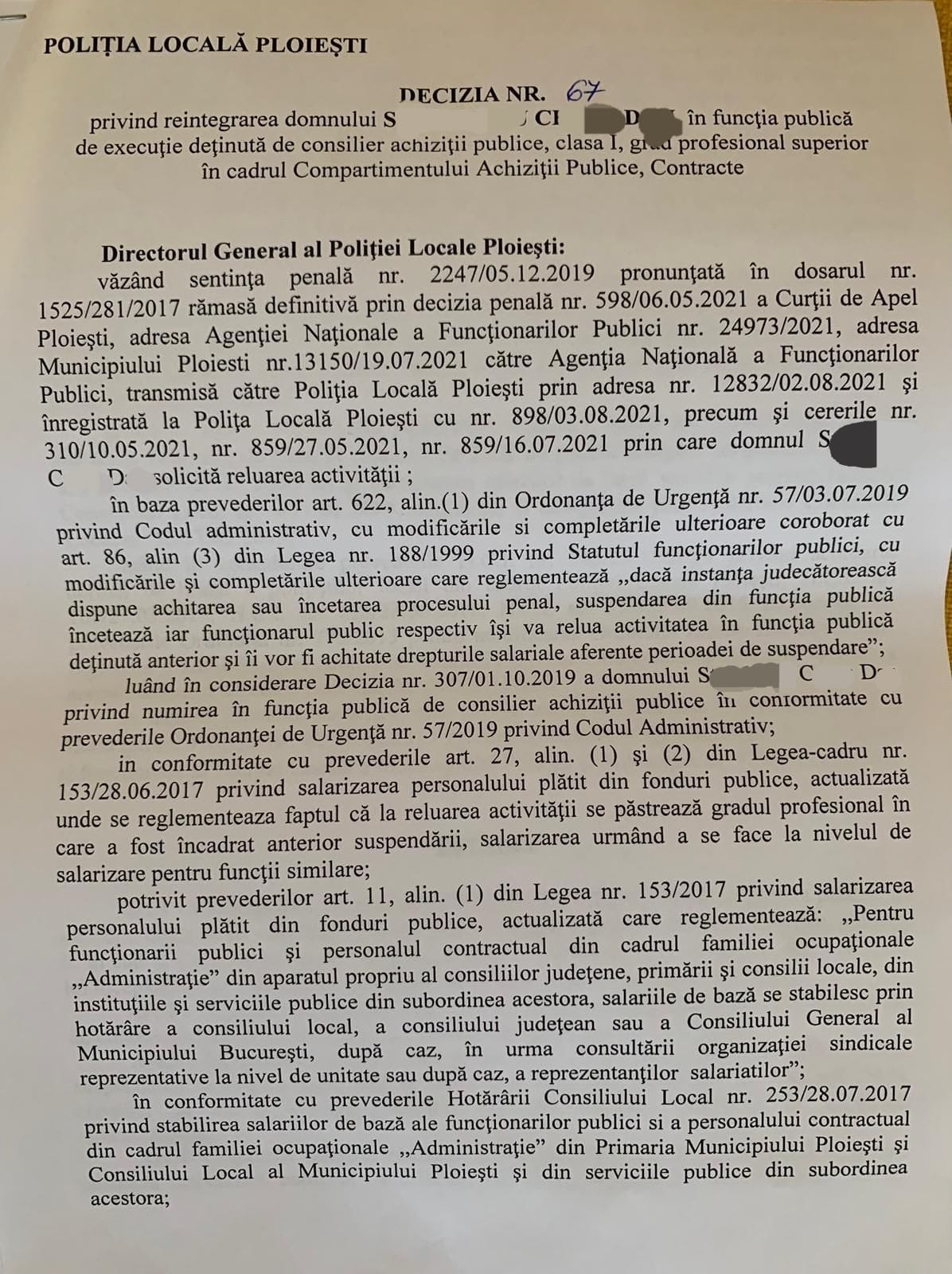 Acesta s-a adresat si instantei, in civil, unde – prin Hotarârea 2831/2021 a Tribunalului Prahova care a fost emisa in data de 16.11.2021, o hotarare prin care reclamantul a castigat din nou despăgubiri egale cu salariile indexate, majorate si reactualizate si cu celelalte drepturi de care ar fi beneficiat pe întreagă perioadă de suspendare a contractului individual de muncă si reancadrarea pe postul de functionar public detinut anterior la achizitii din cadrul Politiei Locale Ploiesti.