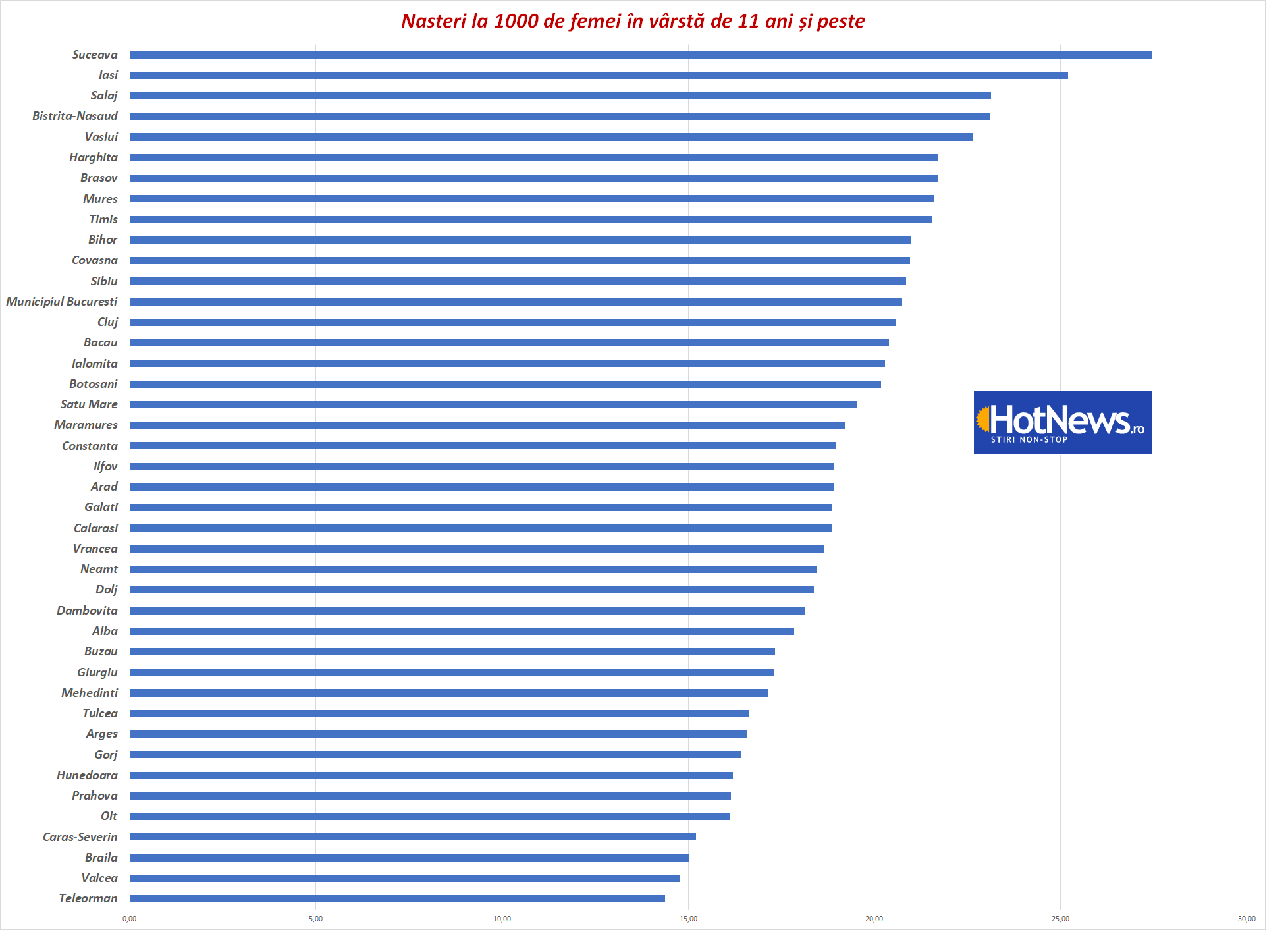 În graficul de mai jos, județele și jumărul de nașteri la mia de femei în vârstă de 11 ani și peste: