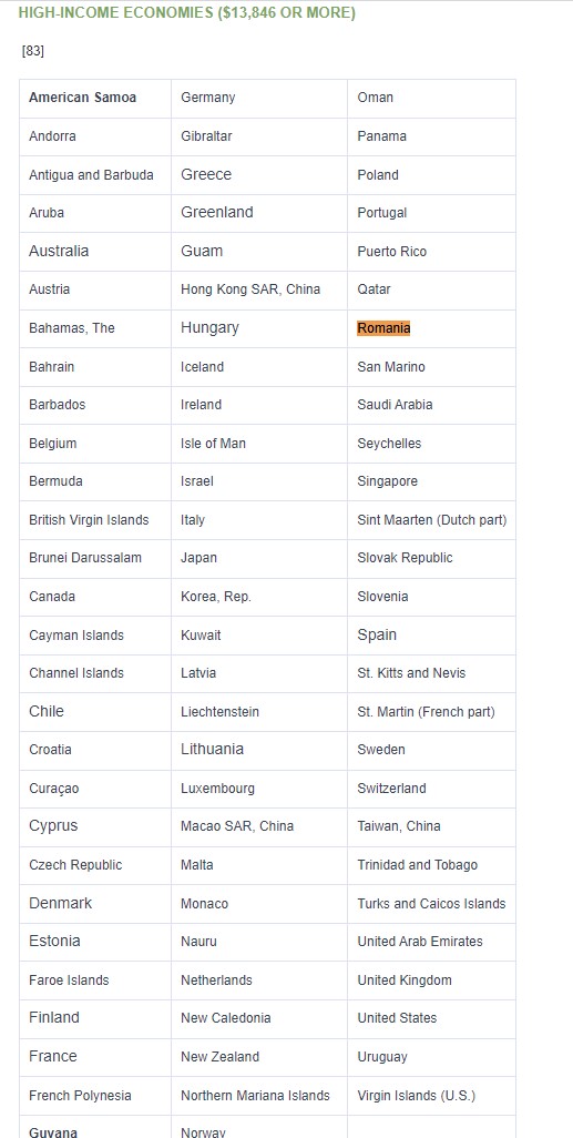 România este considerată o țară cu venituri mari, conform Băncii Mondiale. Asta pentru că venitul pe cap de locuitor luat în calcul de instituție depășește 13.846 dolari.