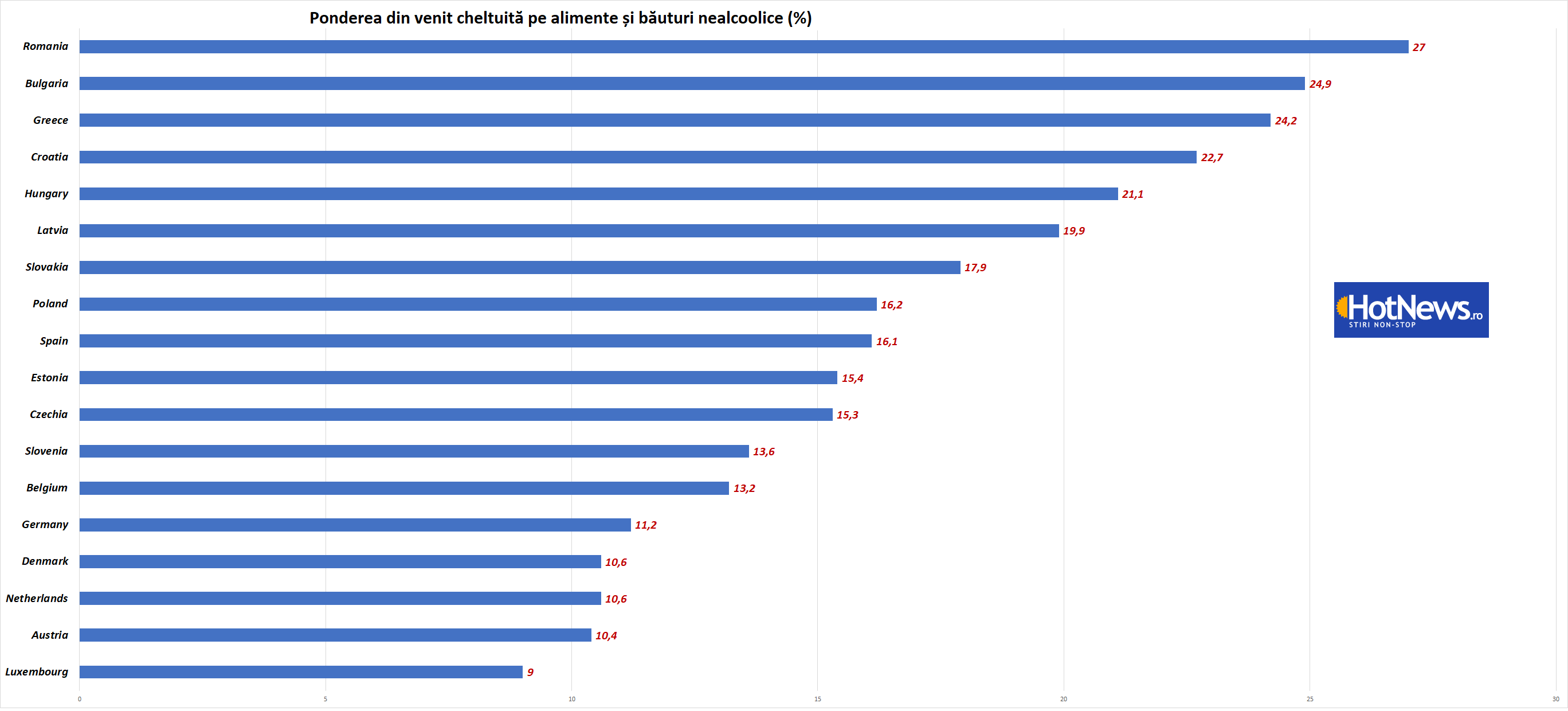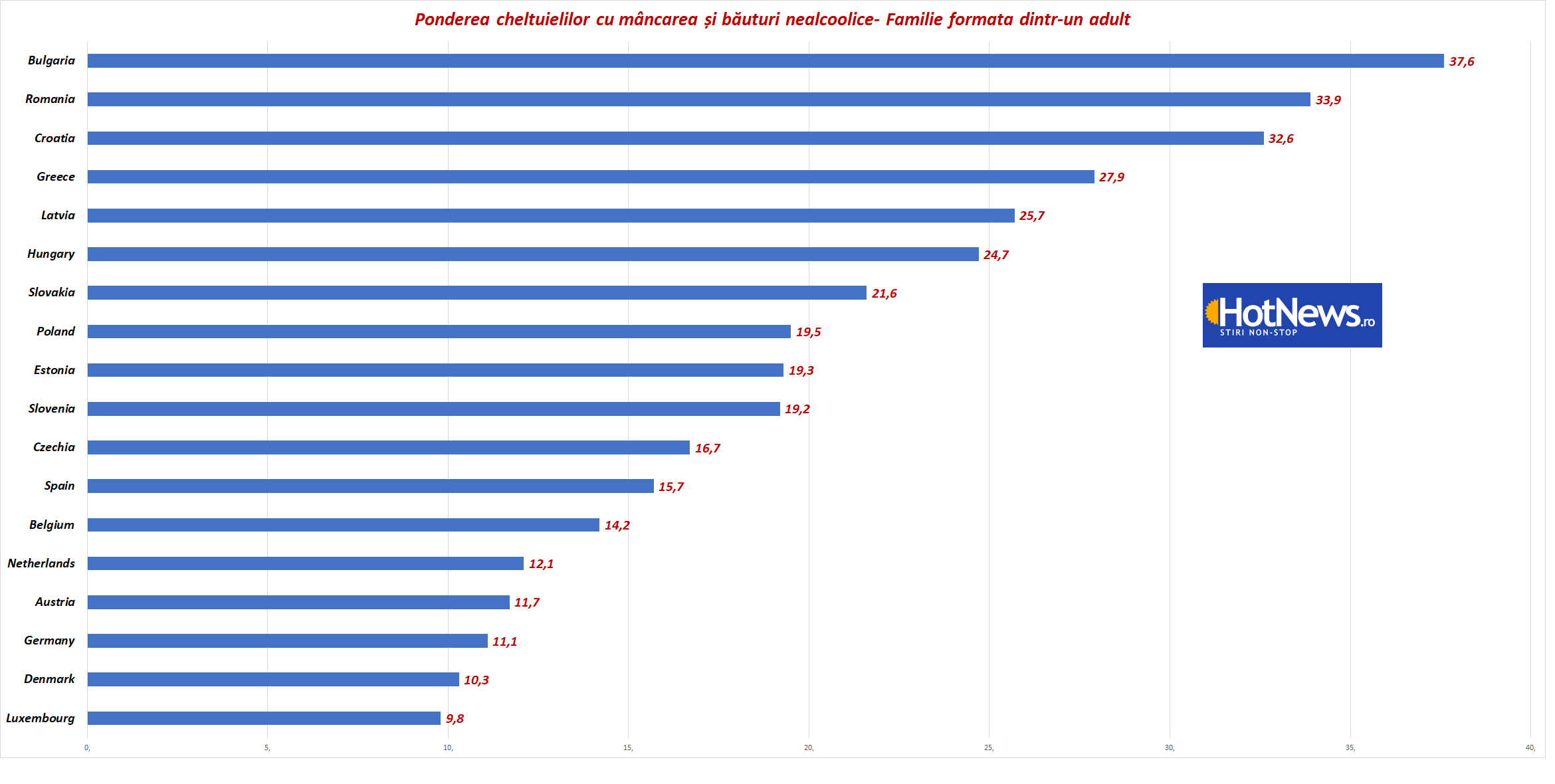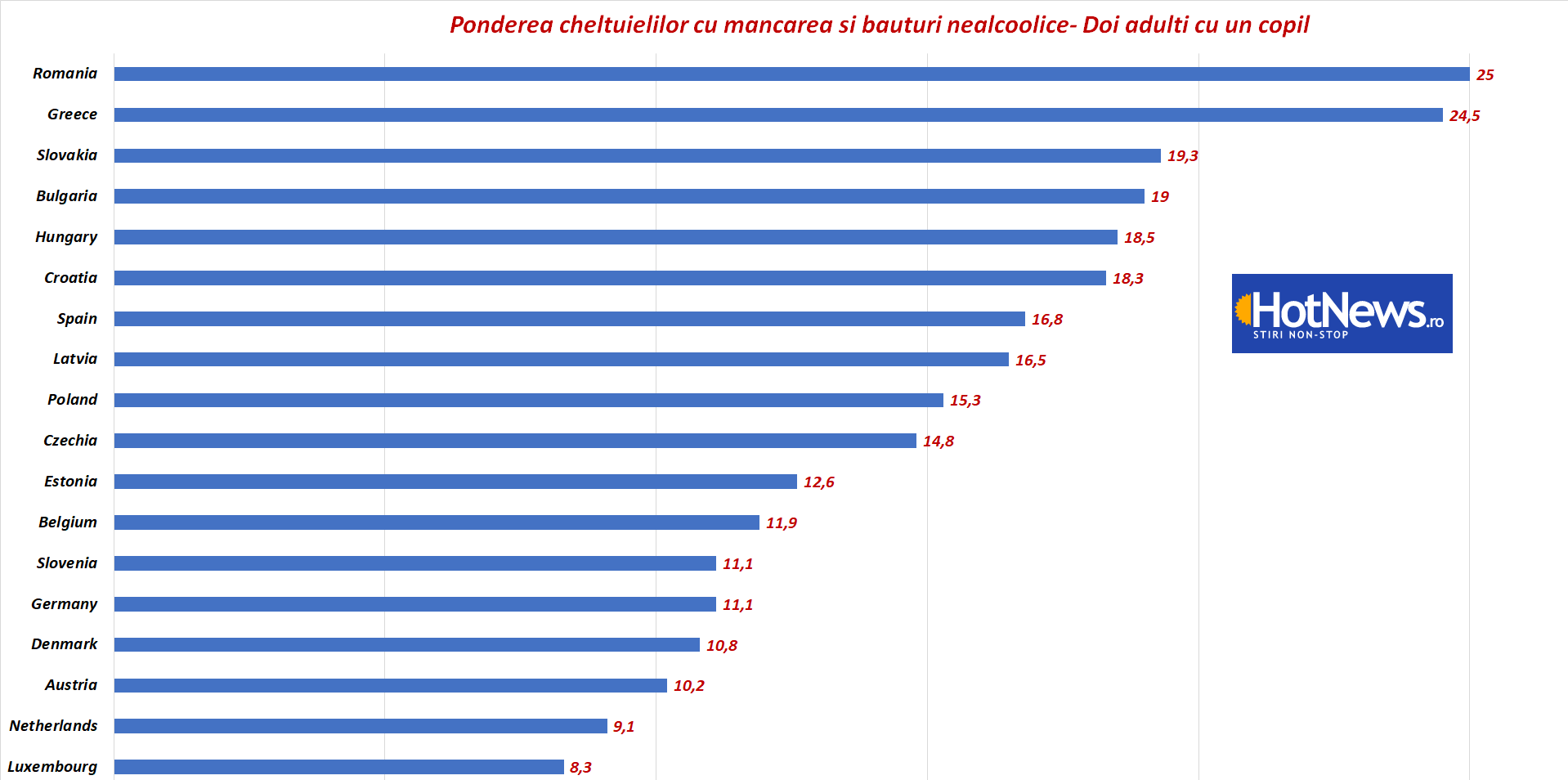 Potrivit Eurostat, care calculează ponderea diferitelor cheltuieli pentru familiile dintr-o persoană și două persoane, fără copii sau cu unul-doi sau trei copii, România iese mereu prima când vine vorba de mâncare