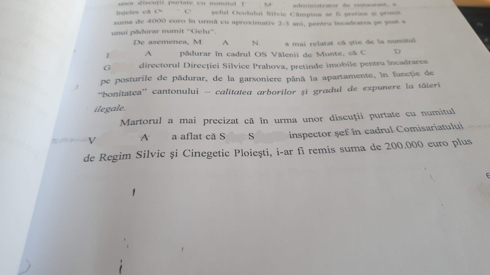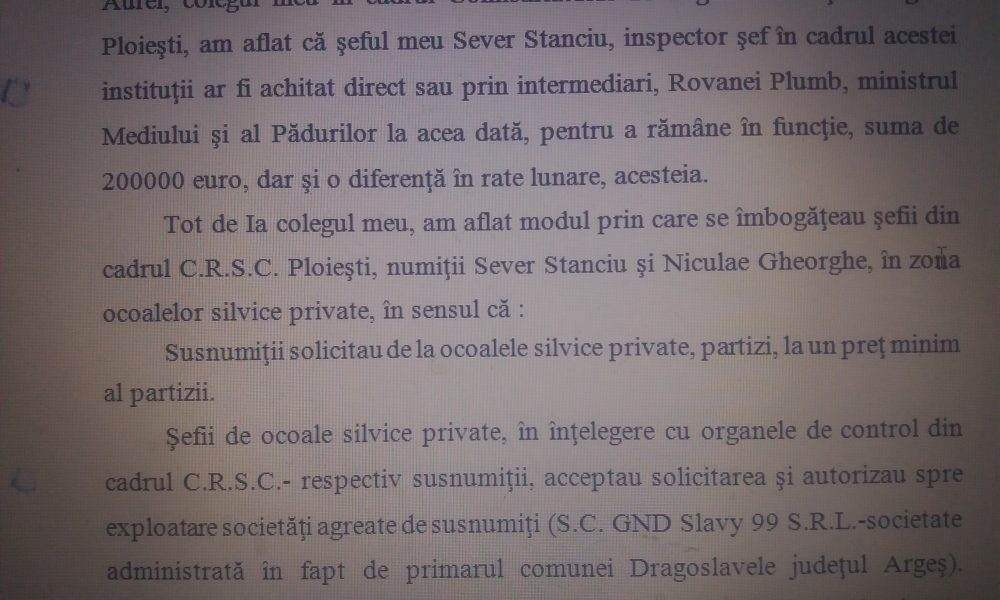Cu ocazia efectuării unui control de către mine, pădurarului lordache Adrian din cadrul Ocolului Silvic Vălenii de Munte, am aflat de la acesta, că numitul Ciomag Dragoş, în calitate de director al Direcţiei Silvice Prahova, pretinde pentru încadrarea unui pădurar în cadrul Ocolului Silvic Măneciu, în funcţie de „bonitatea” (calitatea arborilor şi a gradului de expunere la tăieri ilegale din partea unor terţe persoane) cantonului de la o garsonieră până la un apartament.