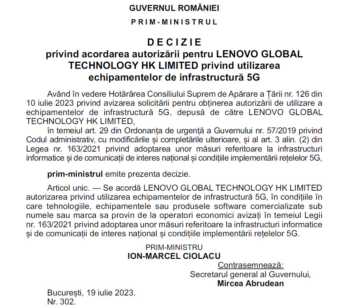 - „Decizia emisă de prim-ministru pentru acordarea autorizării la care faceți referire este conformă prevederilor Legii nr. 163/2021 privind adoptarea unor măsuri referitoare la infrastructuri informatice și de comunicații de interes național și condițiile implementării rețelelor 5G, publicată în MO nr. 590 din 11 iunie 2021.