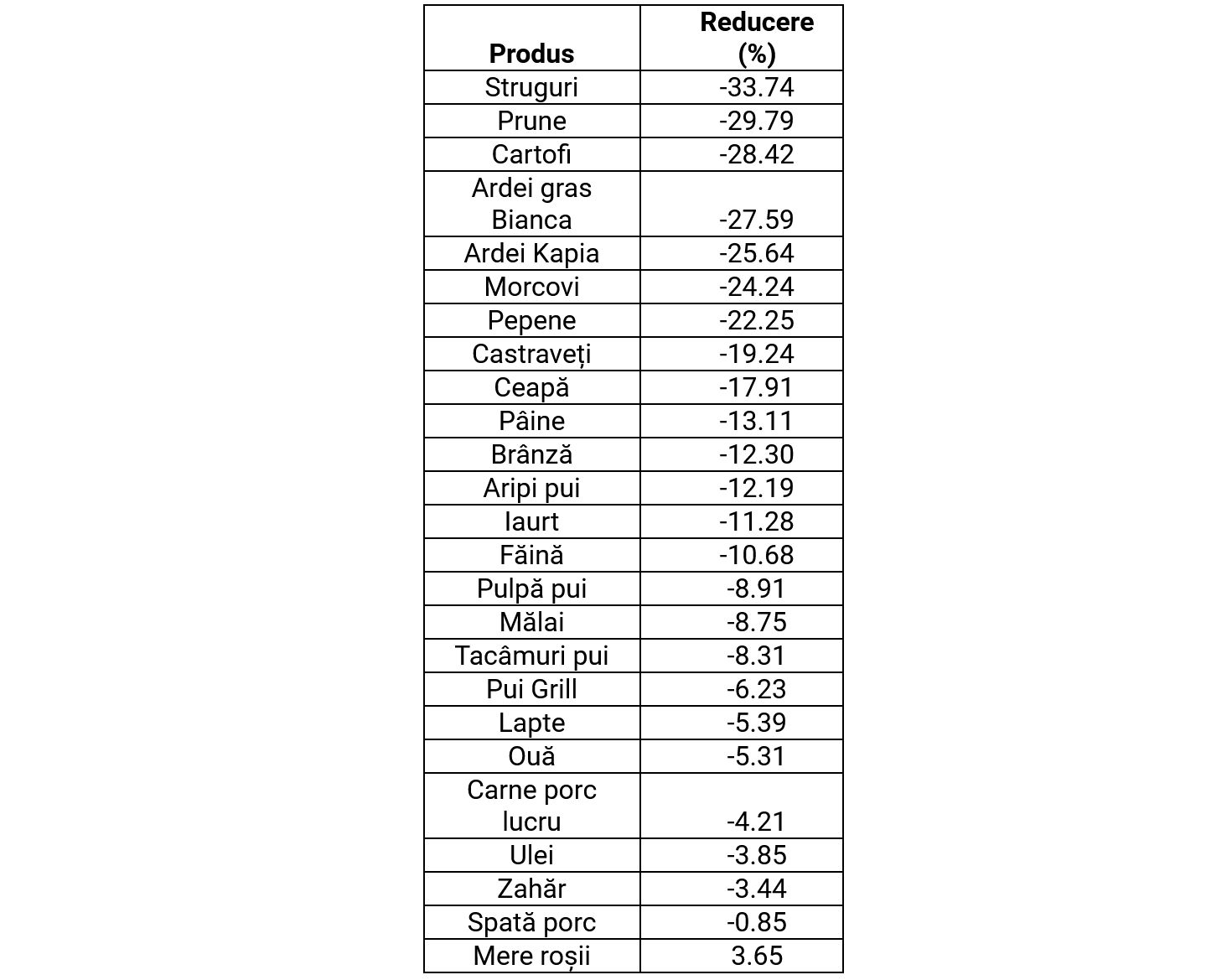 „În urma analizei, am remarcat scăderi ale prețurilor, ce depășesc 40% în cazul unor produse disponibile în anumite magazine, cum ar fi pepenele, aripile de pui, ceapa și ardeii Kapia, și chiar 50%, dacă vorbim de morcovii, prunele, strugurii și cartofii din anumite lanțuri de retail”, a declarat Bogdan Chirițoiu, președintele Consiliului Concurenței.