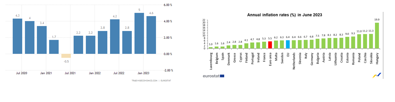 Rata anuală a inflației din zona euro a fost de 5,5% în iunie 2023, în scădere de la 6,1% în mai. Cu un an mai devreme, rata a fost de 8,6%. Inflația anuală a Uniunii Europene a fost de 6,4% în iunie 2023, în scădere de la 7,1% în mai. Cu un an mai devreme, rata a fost de 9,6%. Cifrele sunt publicate de Eurostat, Biroul de Statistică al Uniunii Europene.