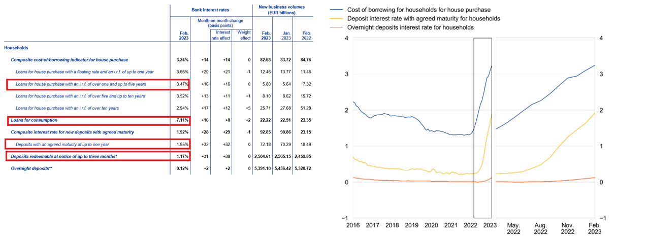 O comparație între costurile împrumuturilor și dobânzile la depozite pentru gospodăriile din zona euro, pentru perioada unui an, 2022-2023, arătă că în 2022 dobânzile la depozitele atrase de la gospodării au avut o relansare timidă până în noiembrie 2022. Prima majorare de dobândă făcută de BCE a fost în iulie 2022.