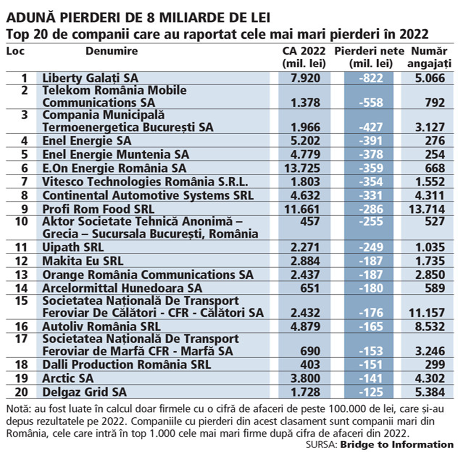 Printre firmele care au declarat pierderi anul trecut găsim pe indienii care au prăduit Sidex-ul din Galați și care au beneficiat de ajutor de stat de vreo 3 -4 miliarde de dolari până astăzi, dar și pe marii furnizori de energie nemții de la E.ON și italienii de la ENEL, firmele statului din domeniul feroviar, păstorite de urmașul lui Lebegue, marii operatori de telefonie mobilă (Orange, Vodafone dar și concetățenii dnei Ursula von der Leyen de la Telekom), supermarket-urile Profi și Cora, exportatorii de lemn Kastamonu, Lidl SCS, patronii mall-ului AFI, firma de trading de energie ungurească MET patronată de prietenii lui Viktor Orban, francezii de la Alstom care au monopolul lucrărilor de la metrou și al livrărilor de rame feroviare către statul român, lanțul de farmacii Dr Max (cel mai extins din țară), marii investitori strategici din industria de piese auto Continental și Yazaki, ba chiar și firma de soft a marelui distribuitor mondial Amazon…