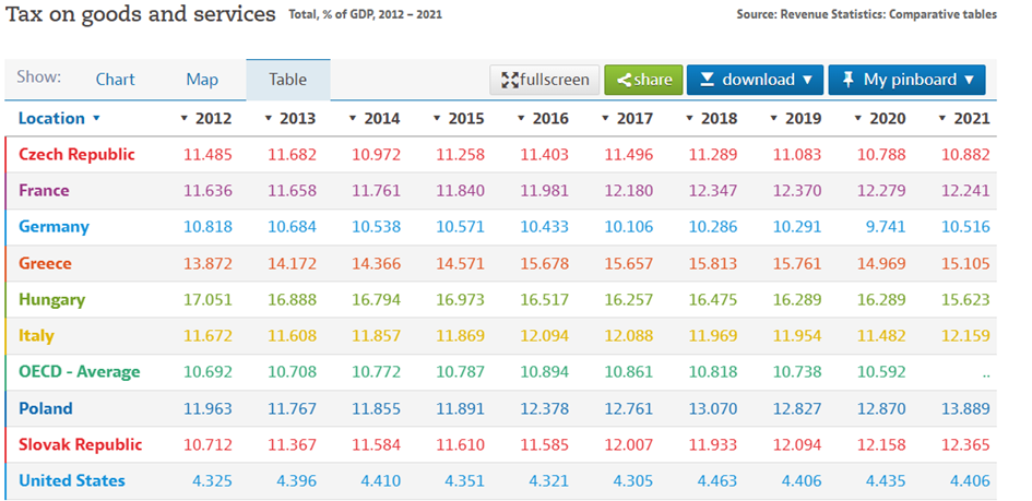 Și să ne mutăm la taxele pe bunuri și servicii (adică taxele „pe consum”- TVA și accize), de unde noi colectăm 10,9% din PIB, Ungaria 15,6% din PIB, Polonia aproape 14% din PIB, iar media OCDE este pe la 11%, cu un minim fabulos de 4,4% din PIB în SUA. Față de modelul european, însă, suntem la distanță de 20-30 până la 50%! Dar avem TVA foarte redus de 5% inclusiv pentru hotelurile de pe litoral care încasează și 1500 euro/cameră pentru un singur weekend…