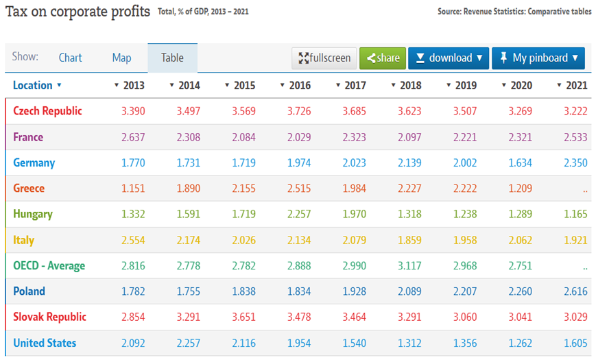 Mai departe, să ne uităm și la impozitul pe profit strâns de statele lumii occidentale: 1,9% în România, 1,16% în Ungaria, 1,6% în America, 2,35% în Germania, 2,6% în Polonia și 3,2% în Cehia. Cu alte cuvinte, aici discrepanța nu e prea mare, stăm chiar bine, spre deosebire de impozitul pe venit.