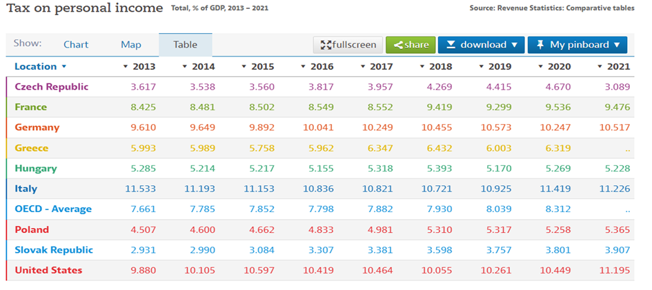 Hai să vedem acum cum pare această structură a veniturilor în raport cu statele occidentale, reunite sub inițialele OCDE. Să începem cu impozitul pe venit și să observăm o medie a statelor din lumea noastră de aproximativ 8% din PIB. Cam triplu față de modestul 2,4% din PIB al impozitului pe venit strâns în țara noastră. Și pentru a nu ne compara cu America și Germania (10-11% din PIB strânși ca impozit pe venit), poate ne comparăm cu cei de talia noastră: Polonia are o pondere de peste 5% din PIB pentru impozitul pe venit, Ungaria una tot de peste 5% din PIB, iar Cehia una de peste 3% din PIB.