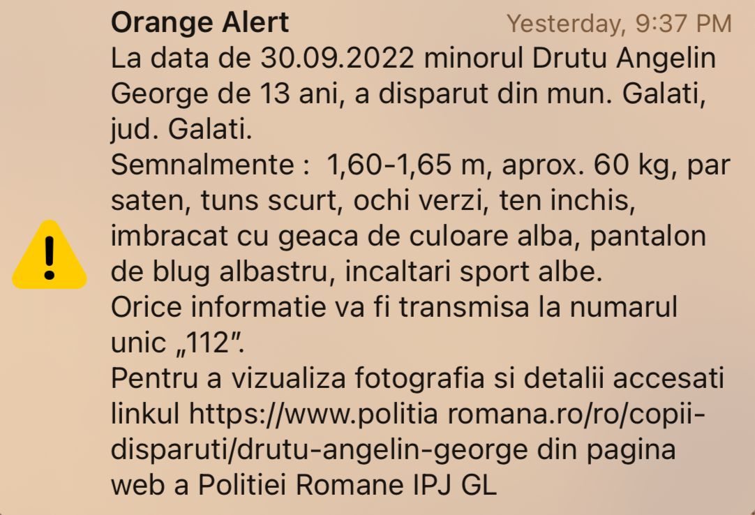 - „Spre exemplu, pentru mesajele tip „alertă severă” și „alertă dispariție copil” modul de vibrare să fie compus din 5 perioade de vibrare cu durata de o secundă şi pauză de 0,5 secunde.”, se arată în răspunsul MAI.