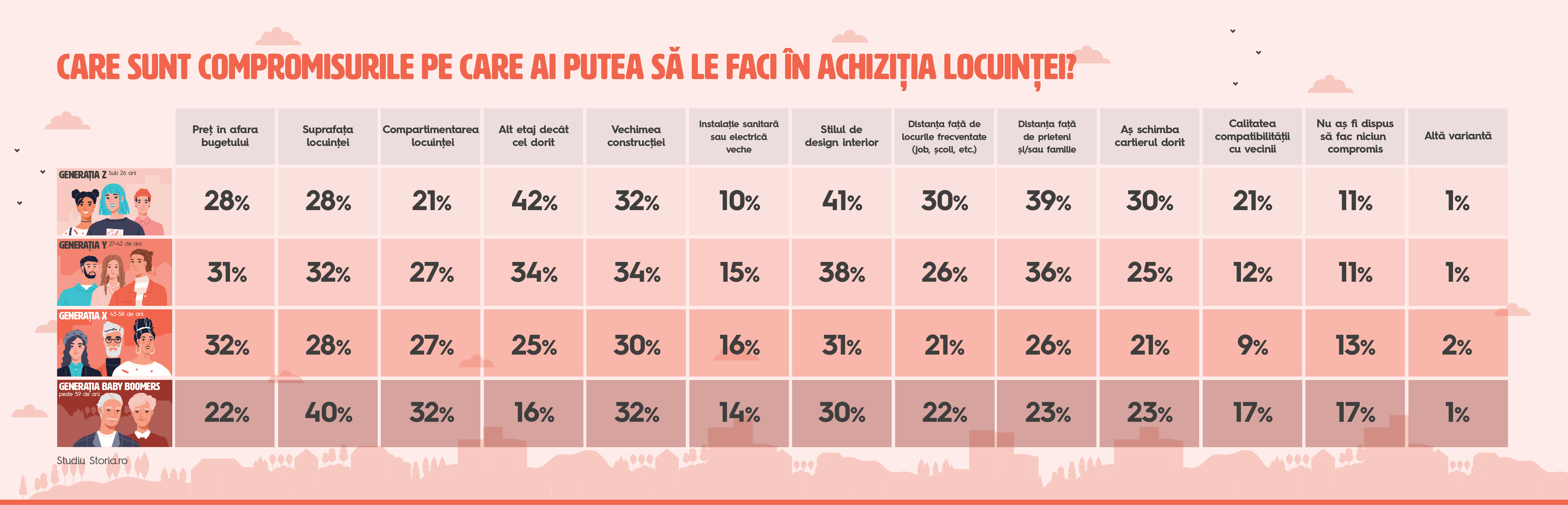 În schimb, cei din Generația X (47-63 de ani) ar fi dispuși, în cea mai mare măsură, la a crește bugetul alocat inițial (32%). Respondenții de peste 59 de ani au afirmat că ar face compromisuri la suprafața locuinței (40%), dar și la compartimentarea și vechimea locuinței, ambele alese în procentaj de 32%. Studiul a fost derulat de Storia.ro, platforma de imobiliare lansată de OLX.