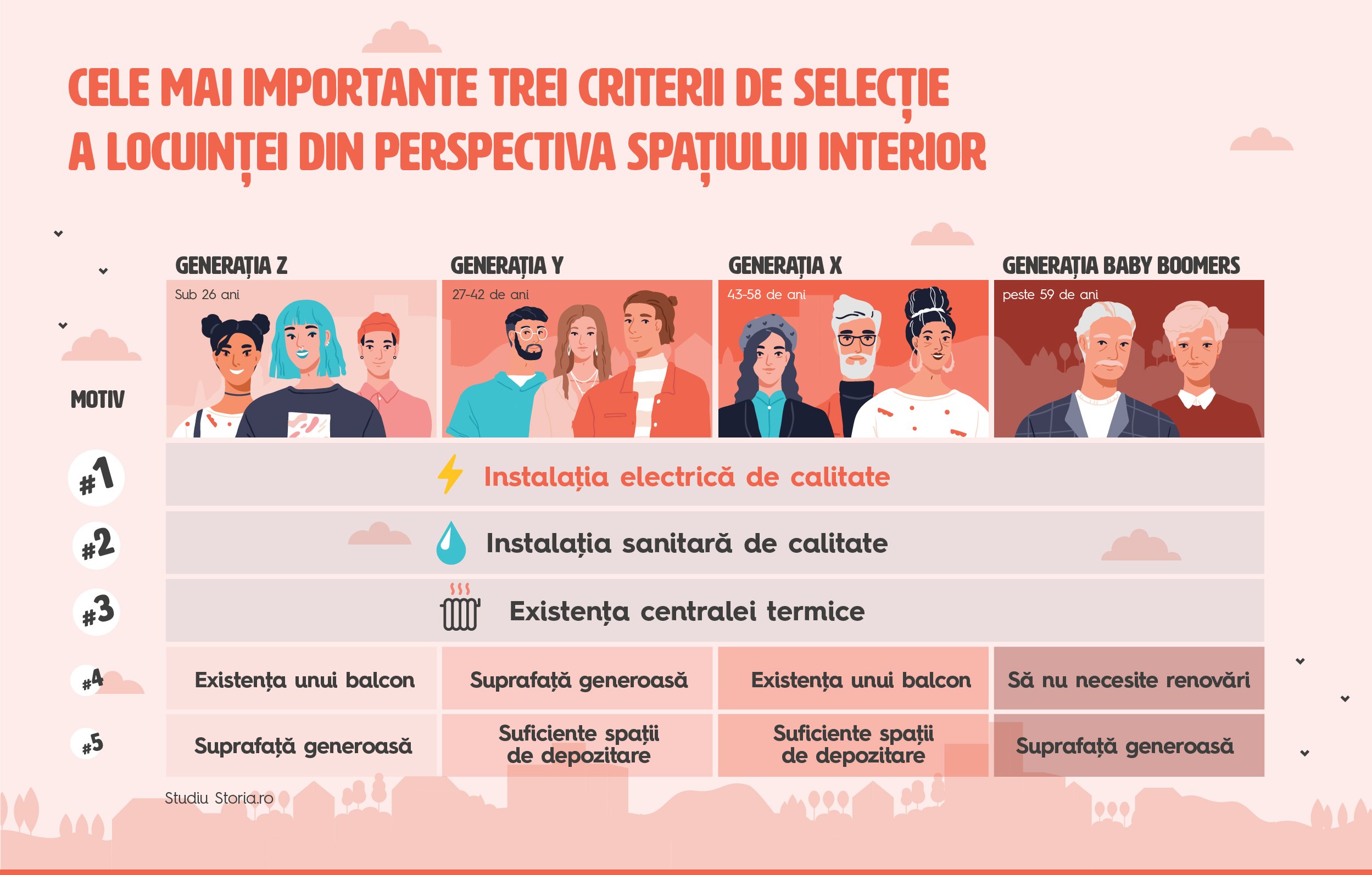 Cele mai importante trei criterii din perspectiva spațiului interior coincid în cazul tuturor generațiilor analizate și includ: pe primul loc instalația electrică de calitate, pe al doilea loc instalația sanitară de calitate, iar pe al treilea loc existența centralei termice.