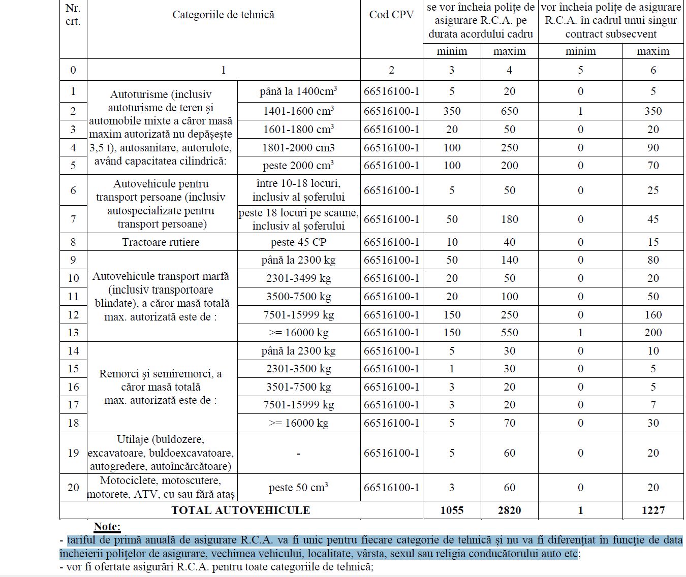 - „Tariful de primă anuală de asigurare R.C.A. va fi unic pentru fiecare categorie de tehnică și nu va fi diferenţiat în funcţie de data încheierii poliţelor de asigurare, vechimea vehicului, localitate, vârsta, sexul sau religia conducătorului auto etc;”, se arară în caietul de sarcini.