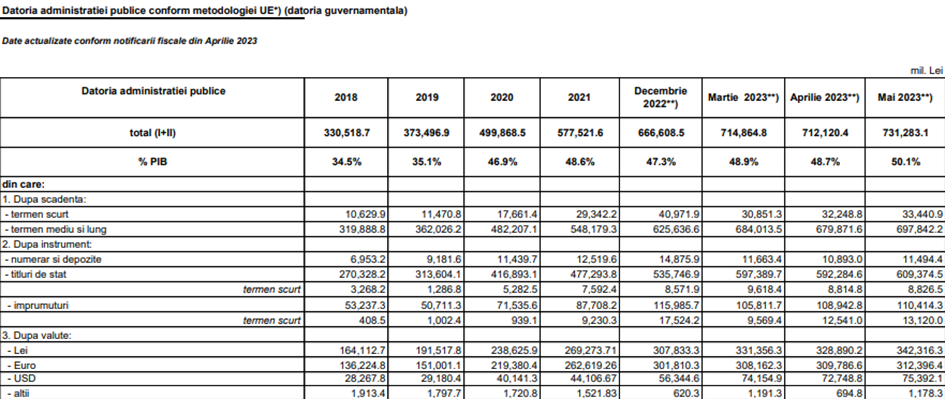 În al doilea rând, statul poate face tot ceea ce vrea guvernul să facă. Mai ales să se împrumute, astfel încât datoria publică a României s-a dublat în perioada despre care vorbim, de la 373 de miliarde de lei în decembrie 2019 la 731 de miliarde de lei în mai 2023: