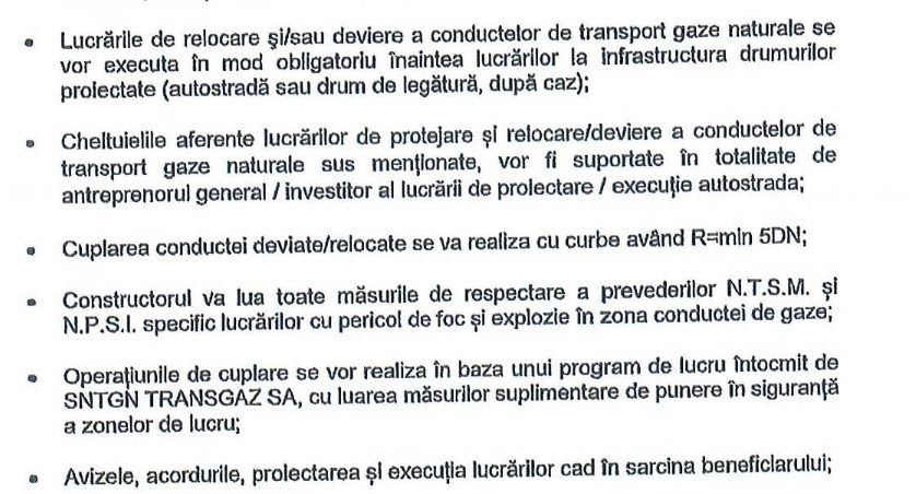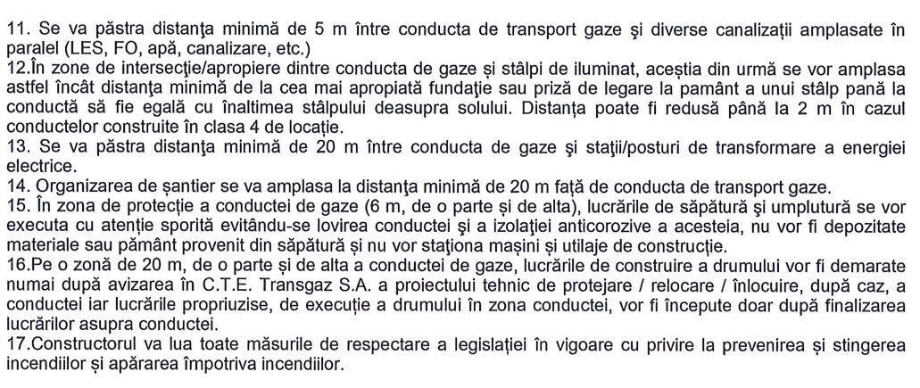 – Pe o zonă de 20 m, de o parte și de alta a conductei de gaze, lucrările de construire a drumului vor fi demarate numai după avizarea în CTE Transgaz a proiectului tehnic de protejare/ relocare/ înlouire, după caz, a conductei, iar lucrările propriu-zise, de execuție a drumului în zona conductei vor fi începute doar după finalizarea lucrărilor asupra conductei