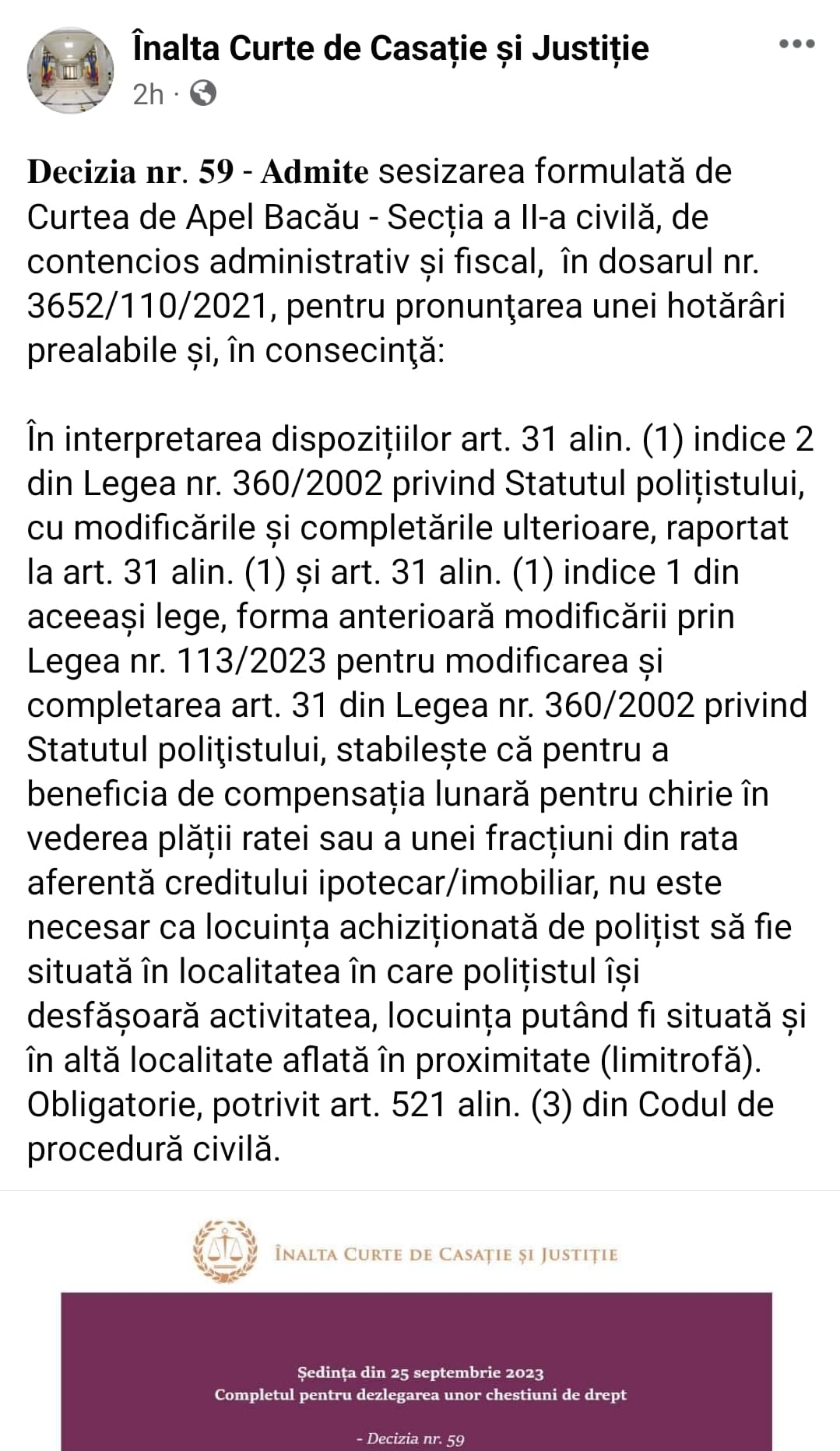 Chiar dacă prin Legea nr 113/2023, Statutul polițistului a fost modificat, iar polițiștii pot opta acum pentru accesarea compensației de chirie pe o distanță de 70 km de locul unde își desfășoară activitatea. Decizia nr 59 emisă ieri va produce efecte atât pentru situațiile în care există deja procese pe rolul instanțelor de judecată și care nu au fost încă soluționate, cu privire la polițiștii care își achiziționaseră o locuință într-o localitate învecinată și care au solicitat transformarea chiriei în rată la bancă, cât și pentru cei care și-au achiziționat o locuință într-o localitate limitrofă locului de muncă și care încă nu au solicitat acest drept.