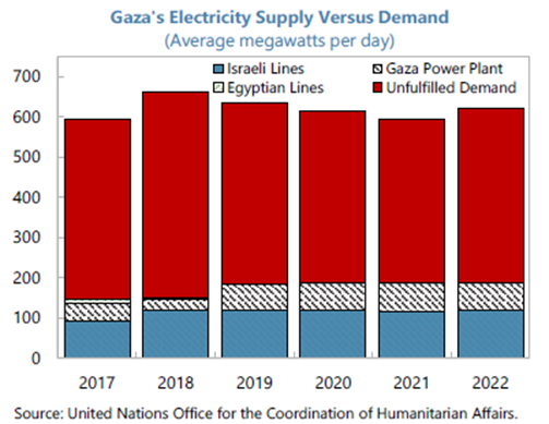 Este, deci, cât se poate de clar că vorbim de două entități total de-conectate politic, dar și ca nivel de dezvoltare economică, cu o fâșie Gaza extrem de săracă și o formulă mult mai decentă în West Bank. Ca urmare a războaielor prea dese cu Israelul, cererea de electricitate în Gaza este satisfăcută într-o proporție de doar o treime, cu un regim de furnizare/lipsă de electricitate în reprize egale, de câte 12 ore. Furnizorii de electricitate din Gaza sunt compania israeliană (IEC) și centrala proprie din Gaza City, acestea furnizând în total puteri nete de câte 180 de MW, deși zona are nevoie de aproximativ 450 MW:
