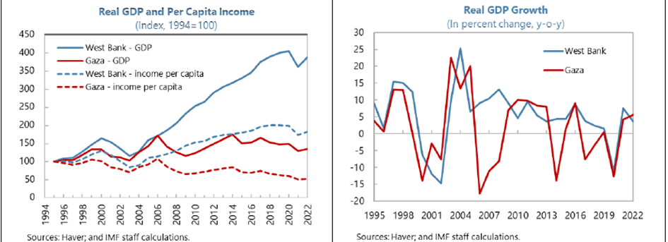 Gaza și West Bank trăiesc în două lumi diferite, cu un PIB/locuitor și un venit mediu/locuitor de patru ori mai mari în West Bank decât în Gaza: