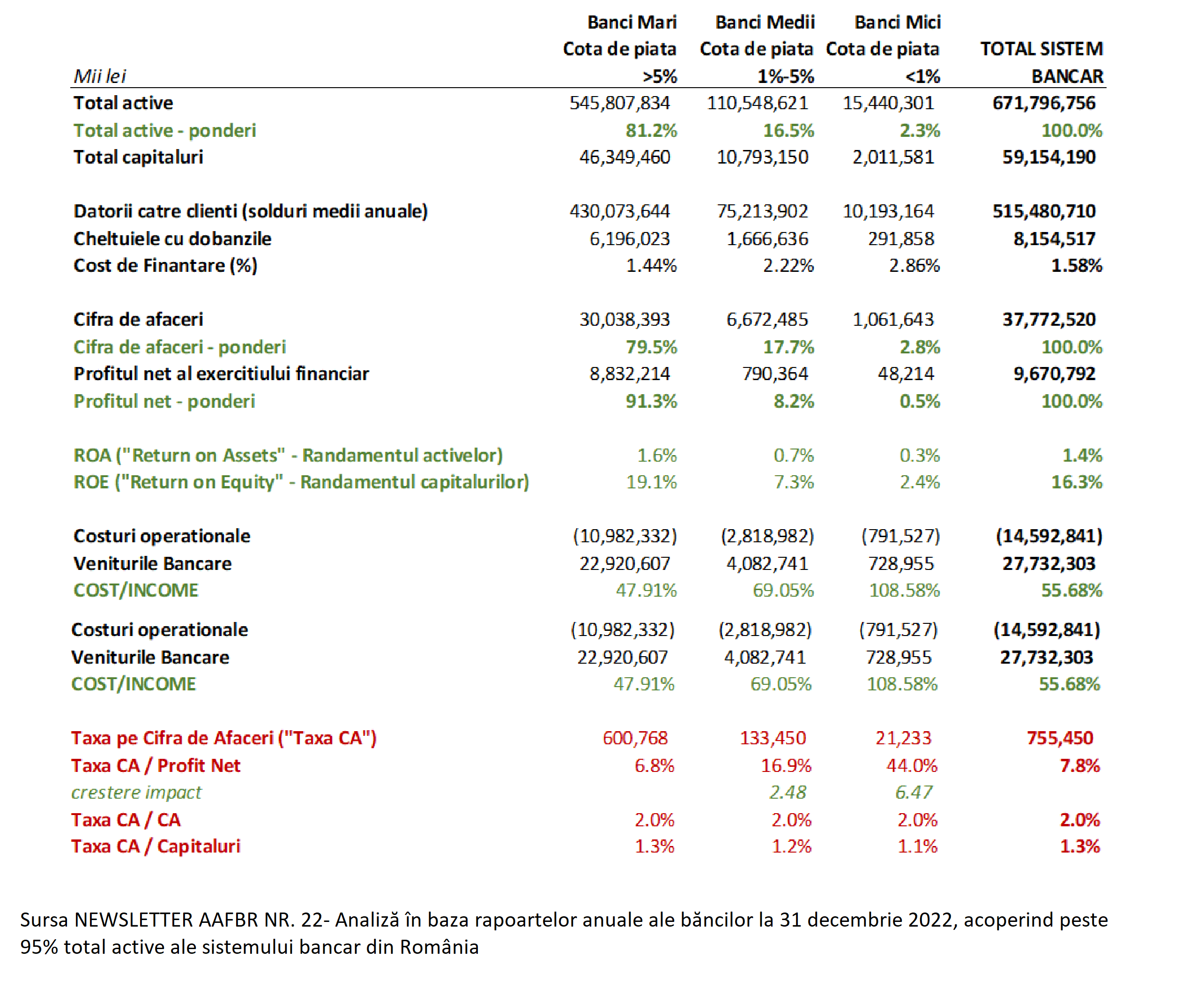 Tabelul de mai jos reprezintă analiza efectuată privind performanța financiară și impactul noii taxe pe cifra de afaceri asupra băncilor care își desfășoară activitatea în Romania (cifrele reprezintă valori agregate pe fiecare categorie de mărime, respectiv pe întregul sistem bancar):