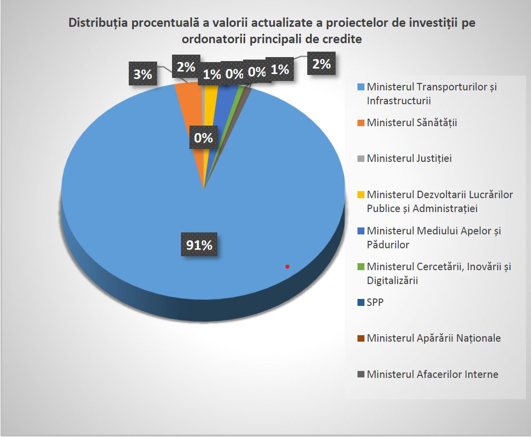 Din perspectiva valorii actualizate totale a proiectelor de investiții publice semnificative, Ministerul Transporturilor și Infrastructurii deține cea mai ridicată pondere, urmat de Ministerul Sănătății.