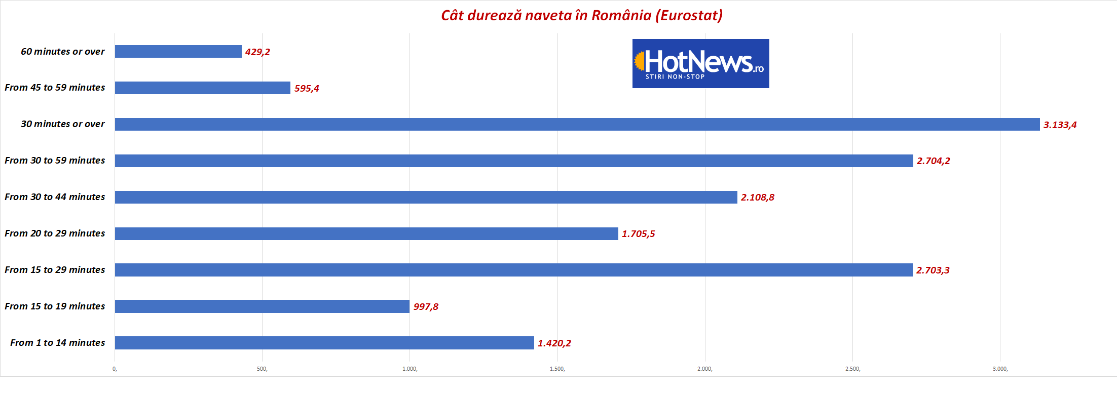 Durata navetei lucrătorilor români (datele din grafic sunt în mii de persoane) , conform Eurostat: