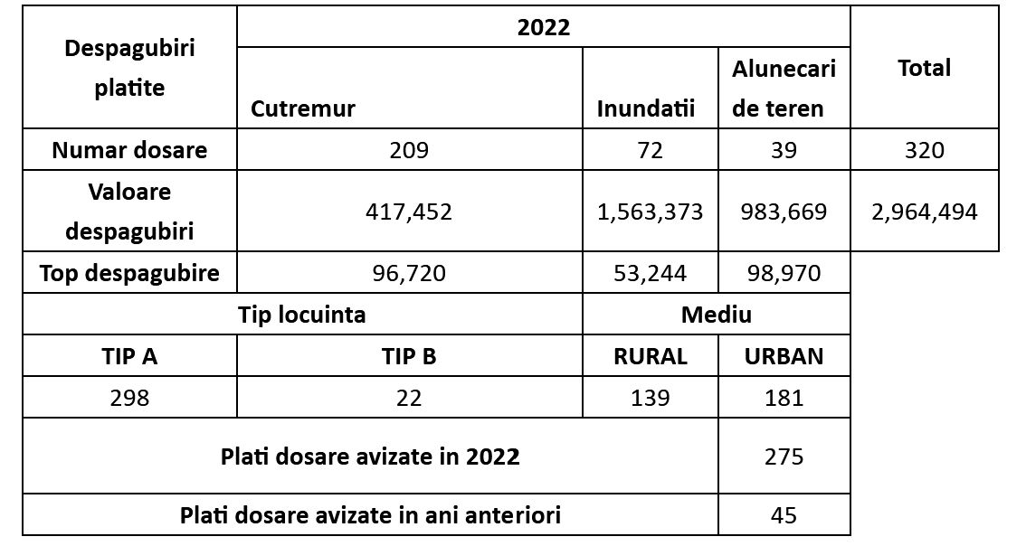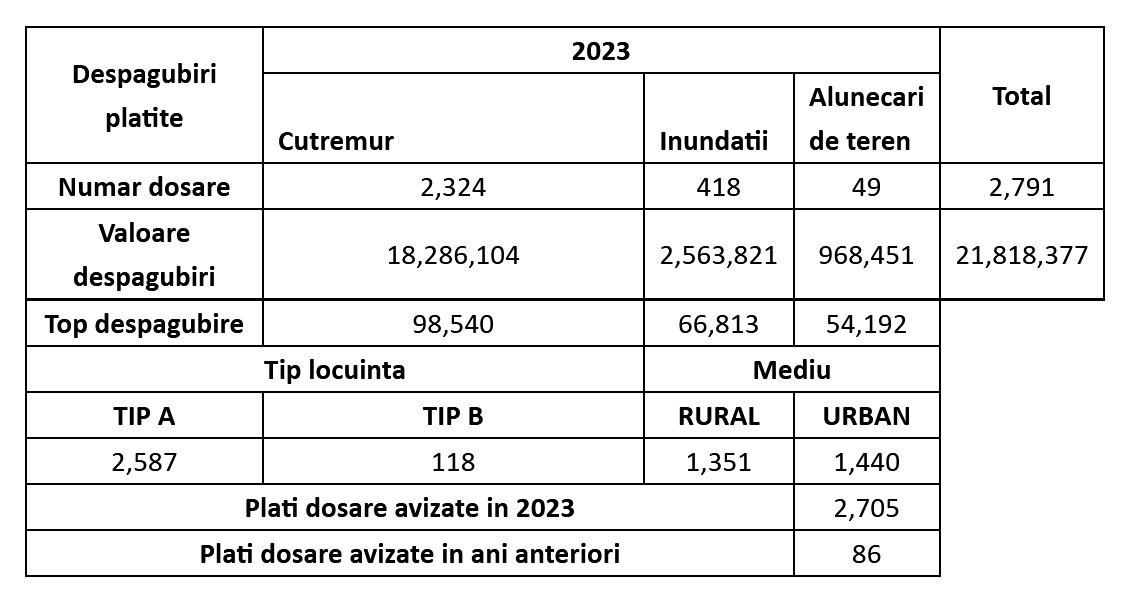 Spre comparație, în 2022, PAID a plătit despăgubiri de aproape 3 milioane de lei, cea mai mare parte din această sumă pentru daune provocate de inundații.