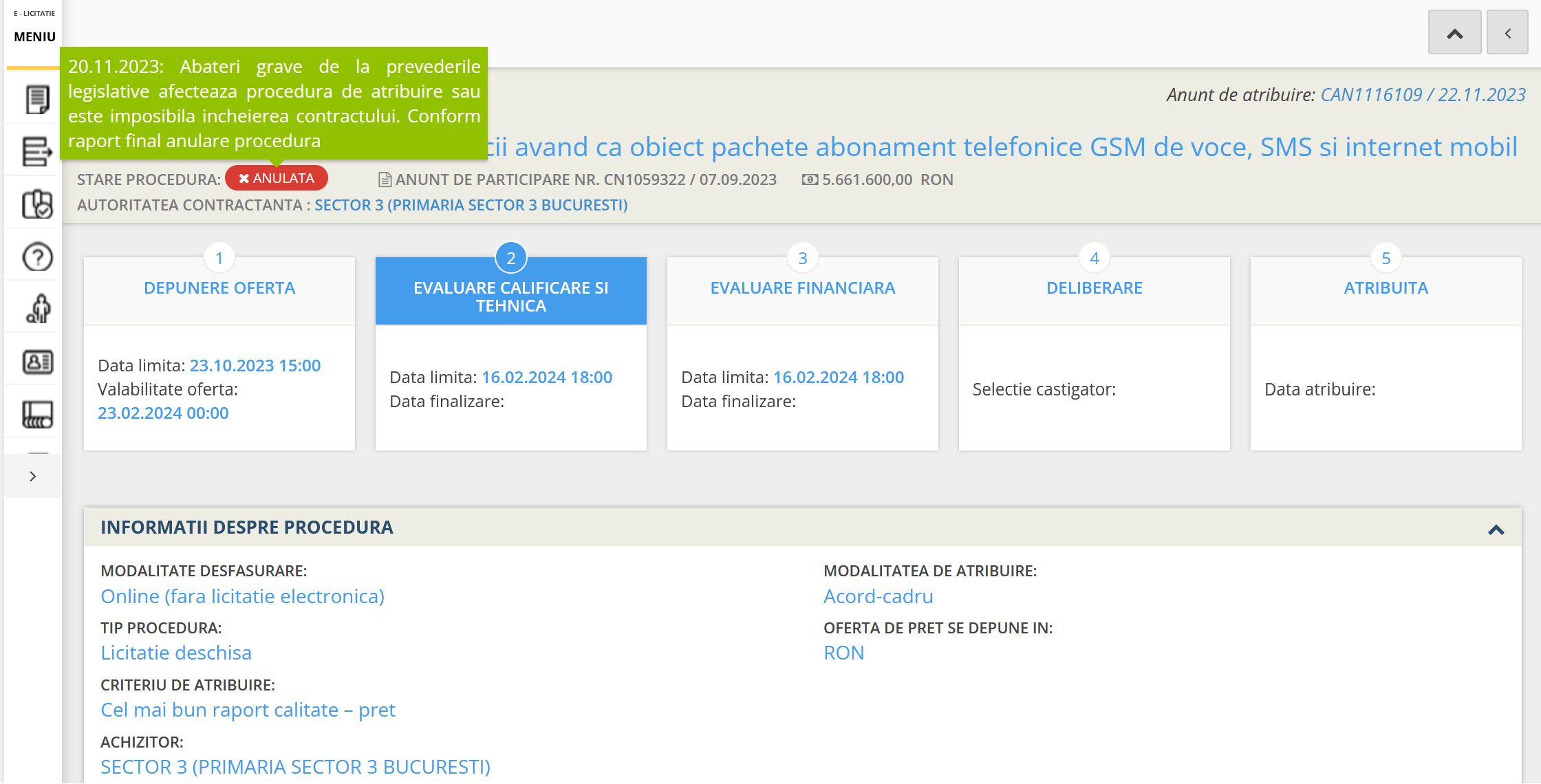 În cadrul anunțului de licitație din SEAP este prezentat ca motiv al anulării: „abateri grave de la prevederile legislative afectează procedura de atribuire sau este imposibilă încheierea contractului.”