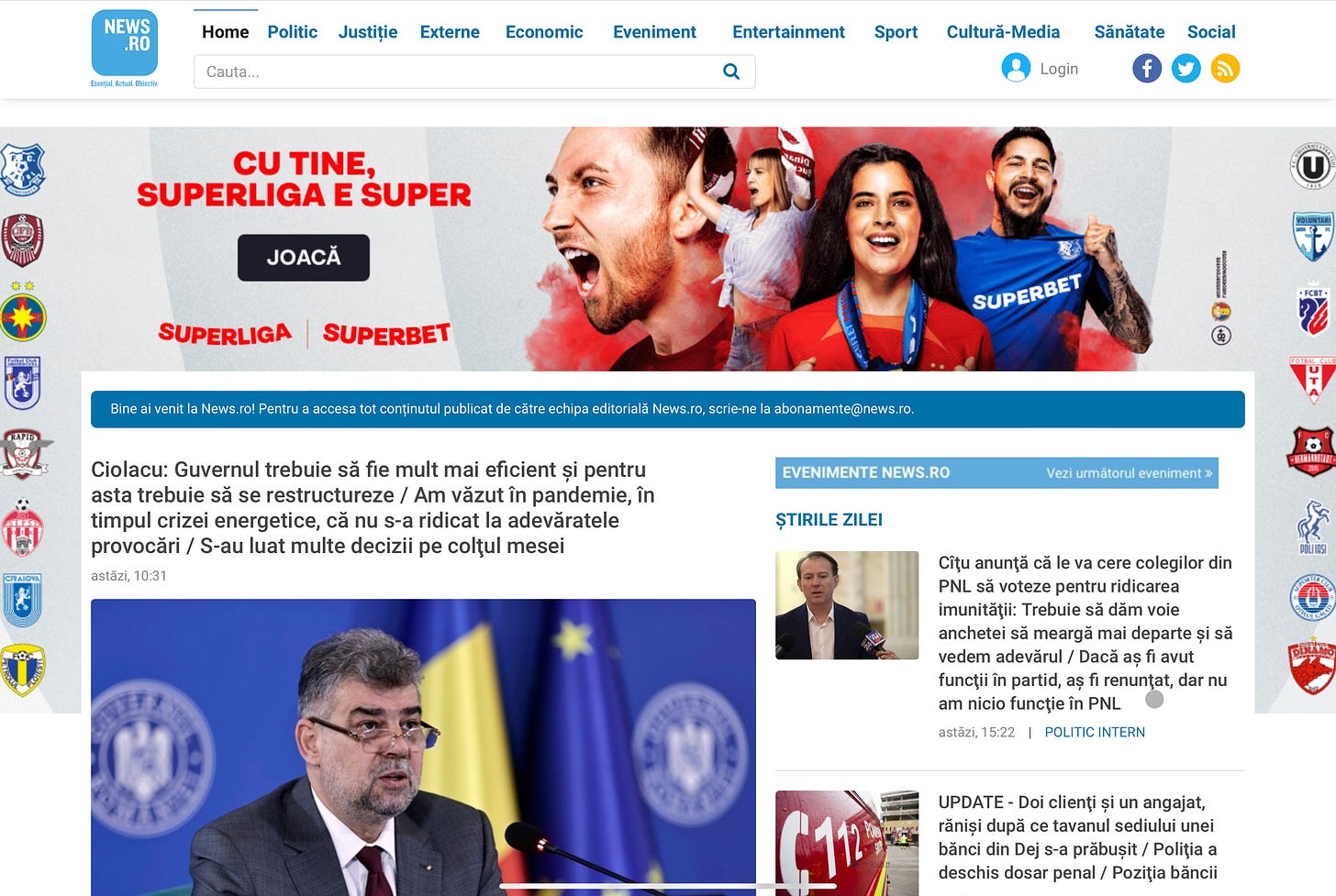 (Ilustratie cu prima pagina de azi a News.ro dominata de reclama la Superbet)