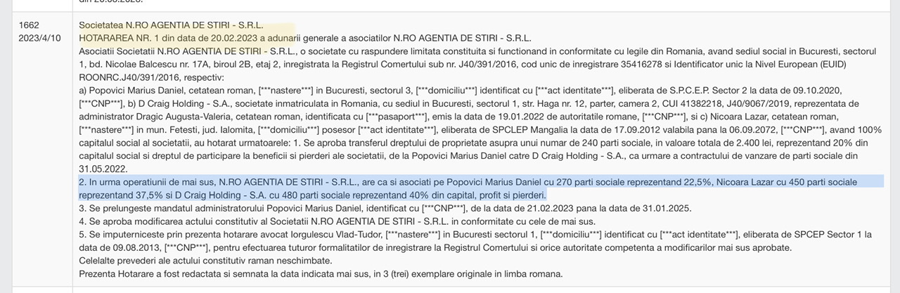 Azi va spun si de ce. Pentru ca, intr-o actiune pe silent, domnul Nicoara Orlando si-a pus taticul pe numele sau Lazar Nicoara sa vanda 40 la suta din firma N.RO Agentia de Stiri SRL catre firma D Craig Holding SA, vehiculul de investitii detinut de boss-ul Superbet, Sacha Dragic, liderul industriei de pariuri din Romania (si nu numai, caci in firma ce opereaza la nivel european e foarte puternica, de vreme ce Dragic l-a recrutat ca sef de CA pe fratele Ursulei von der Leyen, sefa Comisiei Europene).