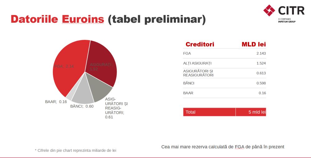 - „Creanțele scadente în cazul Euroins însumează în acest moment 600 milioane de lei, iar expunerea potențială, adică datoriile potențiale ale unor daune care nu s-au materializat în acest moment și care nu sunt certe ar putea ajunge la 5 miliarde de lei, a anunțat în luna septembrie Alina Popa, coordonatorul echipei CITR, lichidatorul judiciar care gestionează falimentul Euroins.