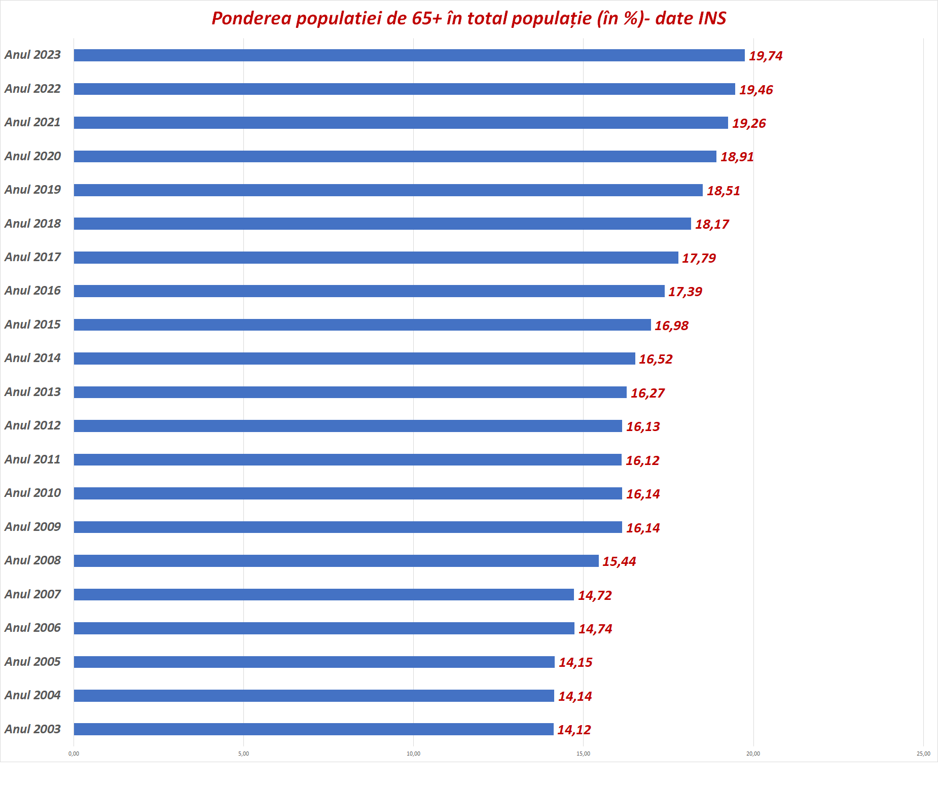 Anul trecut ne-am apropiat de 20% iar estimările INS pentru următorii 25 de ani ne apropie de o pondere de 30% a seniorilor.