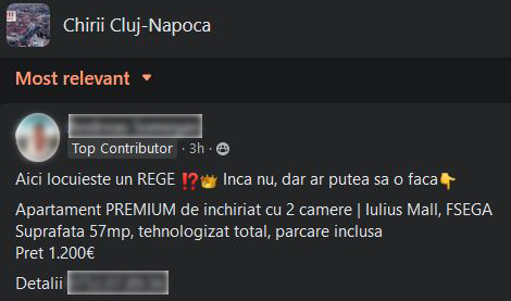 „Aici locuiește un REGE ?! Încă nu, dar ar putea să o facă. Apartament PREMIUM de închiriat cu 2 camere | Iulius Mall, FSEGA Suprafață 57mp, tehnologizat total, parcare inclusă Preț 1.200€”, notează anunțul postat de un agent imobiliar pe grupul „Chirii Cluj-Napoca” de pe Facebook.