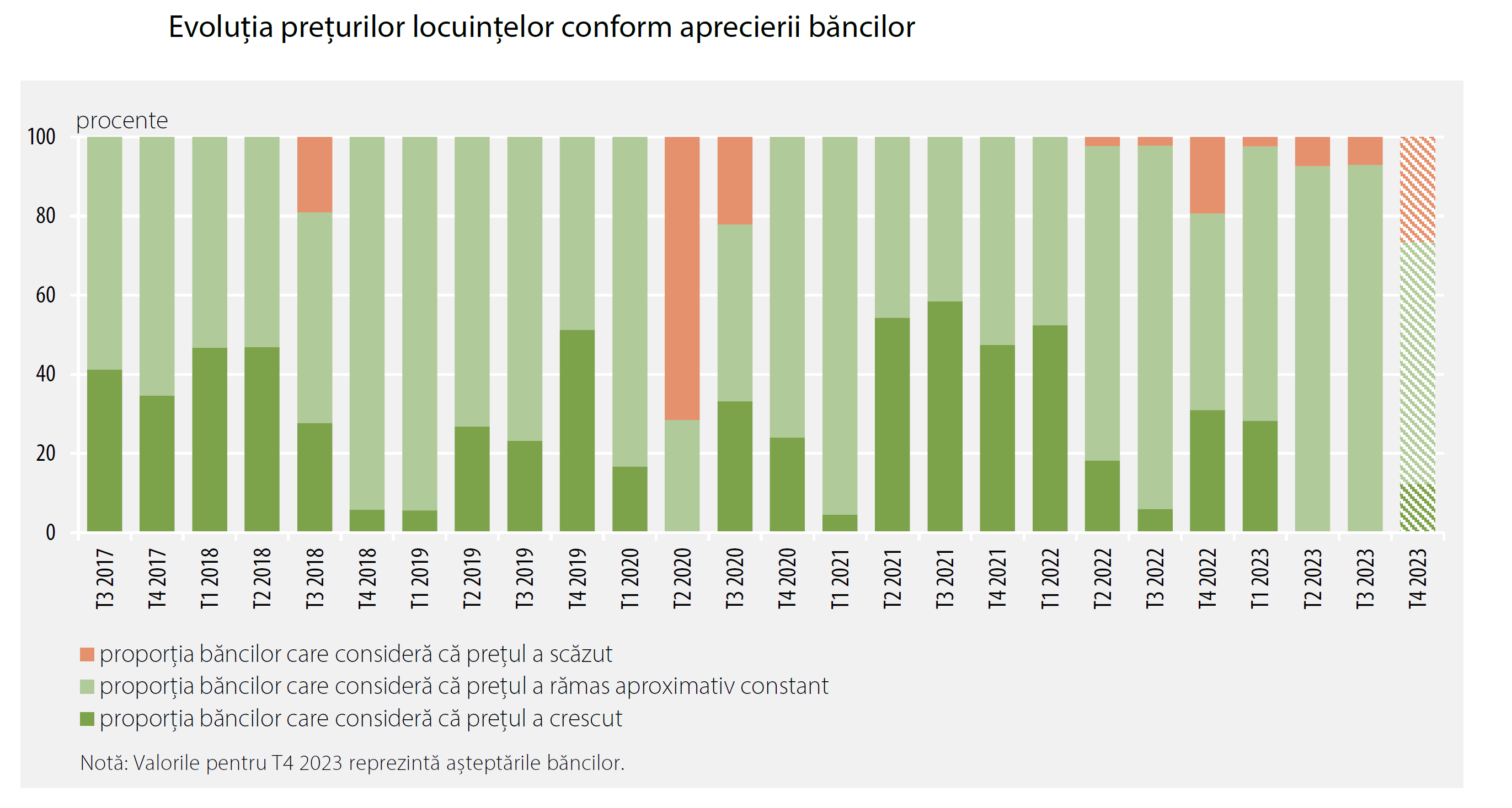 Conform majorității băncilor (93 la sută), prețul pe metru pătrat al unei locuințe a rămas aproximativ constant în T3 2023, pe când 7 la sută au raportat o scădere ușoară a acestuia, similar trimestrului anterior. Pentru T4 2023, 61,2 la sută dintre respondenți estimează un preț aproape neschimbat, 26,5 la sută o scădere într-o anumită măsură, iar 12,3 la sută o creștere relativ modestă