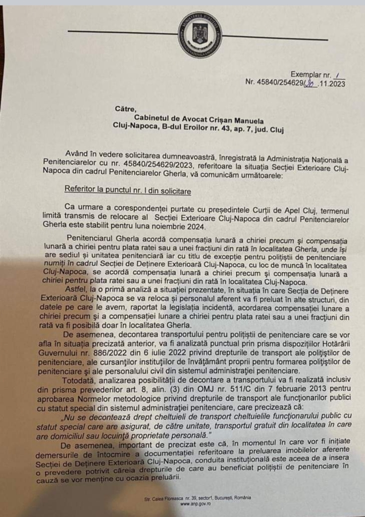 Am văzut ca în țară toate penitenciarele au activități care mai de care cu deținuții: de la mers la meciuri cu ei, la făcut pâine si/sau ca in cazul de la Ploiesti, la deseuri periculoase. Ce părere aveți despre desființarea unui loc de deținere? Mai există în România și în Uniunea Europeană legislație pentru așa ceva? Este vorba despre desființarea Secției Exterioare Cluj-Napoca. Aceasta are o capacitatea maximă de 204 locuri, în prezent având un efectiv de 180 de deținute, clasificate în toate regimurile și 2 puncte de lucru: la Delonghi 40 de detinute(beneficiarul a solicitat dublu) și Carmangeria Moldovan 3 deținute (solicitarea fiind la fel dubla). Secția Exterioară se află într-un corp din spate al Palatului de Justiție Cluj-Napoca cu acces facil la arest și sălile de judecată și al mașinilor care aduc deținuții, acolo unde președintă este Dana Gârbovan. Cat de legala este această decizie în condițiile în care România și-a luat angajamentul în fața CEDO prin Memorandumul Rezmives ca vor mări capacitatea de cazare și vor îmbunătăți condițiile de detenție? De ce ai desființa un loc de deținere în care s-au investit peste 5 miliarde de lei vechi, un loc de deținere cu condiții bune spre foarte bune, raportat la alte locuri de deținere din țară? Noile locuri de cazare cu care se laudă Dan Halchin, sunt ori ale beneficiarilor (cum a fost în cazul Penitenciarului Timișoara), ori fictive, ca și în cazul tabletelor pentru deținuți care cica au intrat în posesia deținuților încă din 20 octombrie 2023, în condițiile în care unele penitenciare rămăseseră în ultima lună din an și fără coli albe pe care să printeze cererile deținuților, sunt dezvaluiiri din interiorul sistemului. Știu, poate e mult de citit, dar puneți-vă și în locul polițiștilor de penitenciare care lucrează acolo. Toți au mers prin concurs, inclusiv șefa de secție care a dat concurs anul trecut. Toate funcțiile sunt ocupate prin concurs, cu munca și sudoare. Acum toate aceste funcții o să fie desființate. Oamenii vor fi nevoiți să facă naveta spre Gherla sau Aiud. Și oamenii ăia au familii, iar polițistele de acolo nu o să aibă cu cine să își lase copii sau cum să îi mai ducă la școli și grădinițe pentru ca o să fie nevoite să facă naveta. Și toate astea pentru ce, pentru niște parcări… Oamenii ăștia nu pot fi trași la răspundere de nimeni? Populația țării trebuie să știe pe ce se cheltuie banul public: pe orice și pe nimic. Facem un loc de detinere cu toate condițiile, perfect functional, care mai și produce prin punctele de lucru, pe bani publici, ai contribuabililor, după care ne trezim ca mai vrem parcări și îl desființăm!