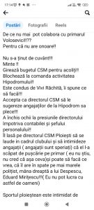 ”De ce nu mai pot colabora cu primarul Volosevici!!?? Nu s-a ținut de cuvânt!!! Minte !! Girează bugetul CSM pentru acoliți!! Blochează la comanda activitatea Hipodromului!! Este condus de Vivi Răchită, îi spune ce să facă!!! Accepta ca directorul CSM să le sugereze angajaților de la Hipodrom sa plece!!! A închis ochii la presiunile directorului împotriva contabilei și șefului personalului!! Îl lasă pe directorul CSM Ploiești să se laude in cadrul clubului și să intimideze angajații ( angajații sunt speriați) că el l-a scăpat de pușcărie pe primar ( eu nu știu) și poate să facă ce vrea, că îl are în spate pe mai marele polițist, mâna dreaptă a lui Despescu, Eduard Mirițescu!!!( Eu nu pot lucra cu astfel de oameni) Sportul ploieștean este intimidat de caracatița !!!!”