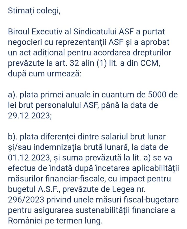 Plata diferenței între această sumă și salariul brut lunar se va efectua de îndată după încetarea aplicabilității măsurilor financiar-fiscale, cu impact pentru bugetul ASF prevăzute de legea 296/2023 privind unele măsuri fiscal-bugetare, se arată în mesajul primit de angajații ASF.