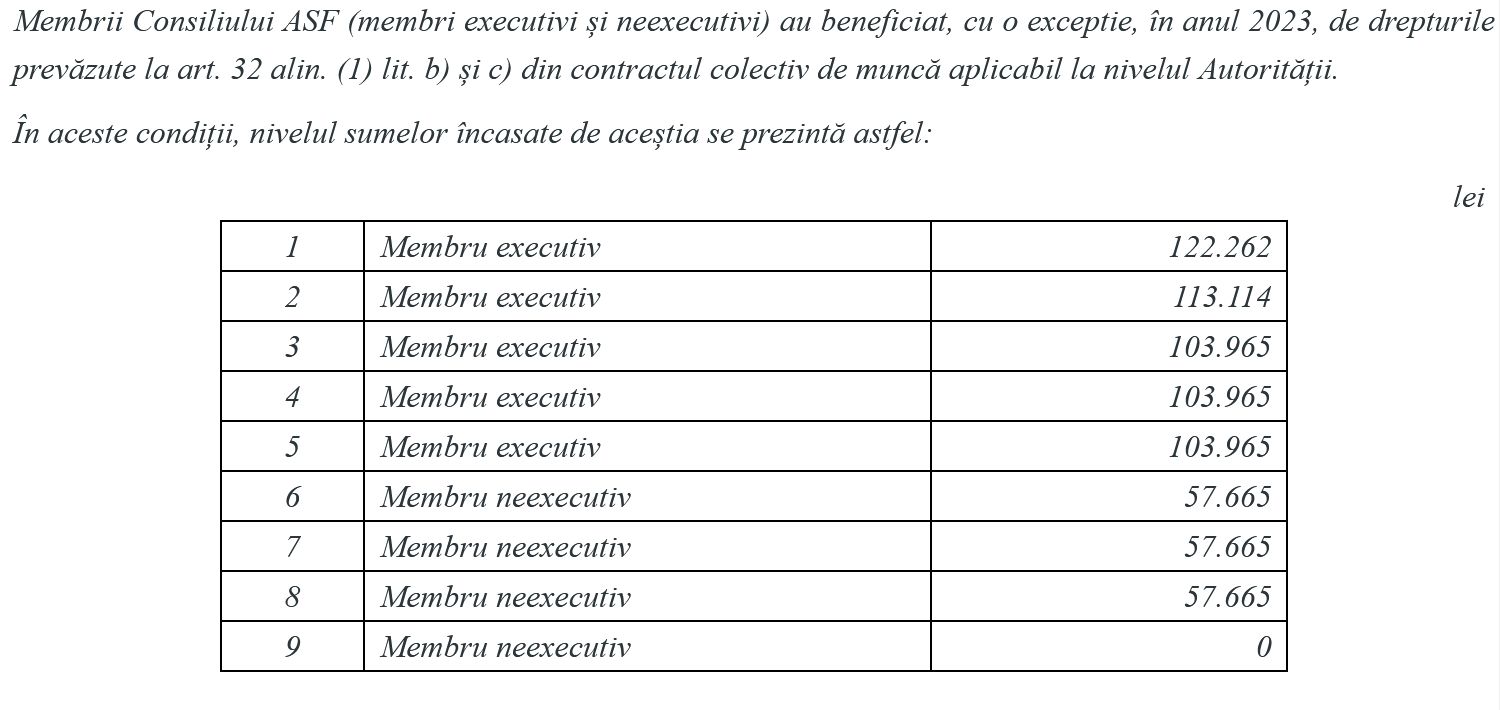 - „Dreptul prevăzut la art. 32 lit. a) din Contractul Colectiv de Muncă aplicabil la nivelul A.S.F. nu a fost acordat în anul 2023. Ca urmare a modificărilor intervenite la Contractul Colectiv de Muncă, angajații și membrii Consiliului A.S.F. reconfirmați la conducerea Autorității au beneficiat, în luna decembrie 2023, de o sumă fixă în cuantum de 2.925 lei.