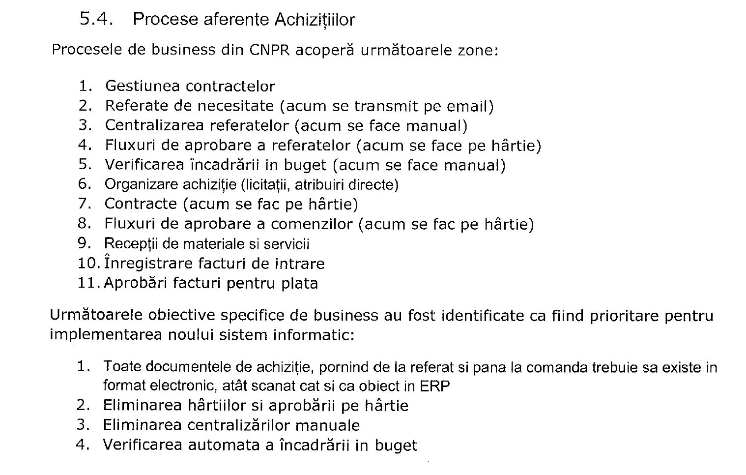 Prin implementarea noului sistem IT, toate documentele de achiziție, pornind de la referat și până la comandă vor exista în format electronic, atât scanat cât și ca obiect în ERP, iar hârtiile și centralizările manuale vor fi eliminate.