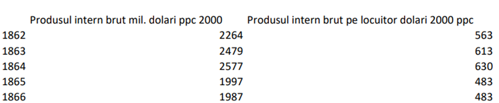 Iar performanța economiei a avut o evoluție similară: o creștere inițială de aproape 12% din 1859 (563 dolari/locuitor) până în 1864 (630 de dolari/locuitor), creștere urmată de o cădere catastrofală de peste 30%, până la 483 de dolari/locuitor în 1866. Practic, țara era, la plecarea lui Cuza din domnie, mai săracă cam cu 10% decât era în momentul alegerii domnitorului.
