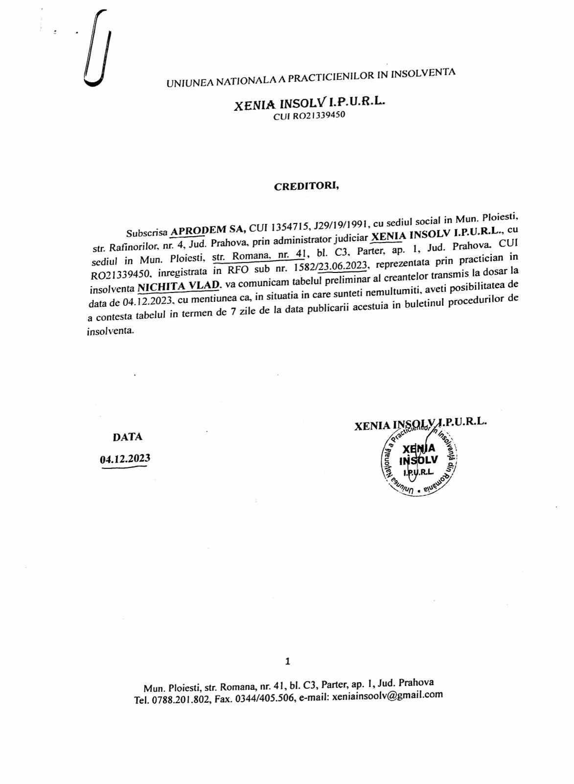 În luna decembrie 2023, XENIA INSOLV, reprezentată de neobositul avocat VLAD NICHITA comunică tabelul creanțelor APRODEM SA. Printre creditori, asociata septagenară LUPU MĂRIOARA care s-a înscris la masa credală cu o sumă de peste 700.000 de lei.