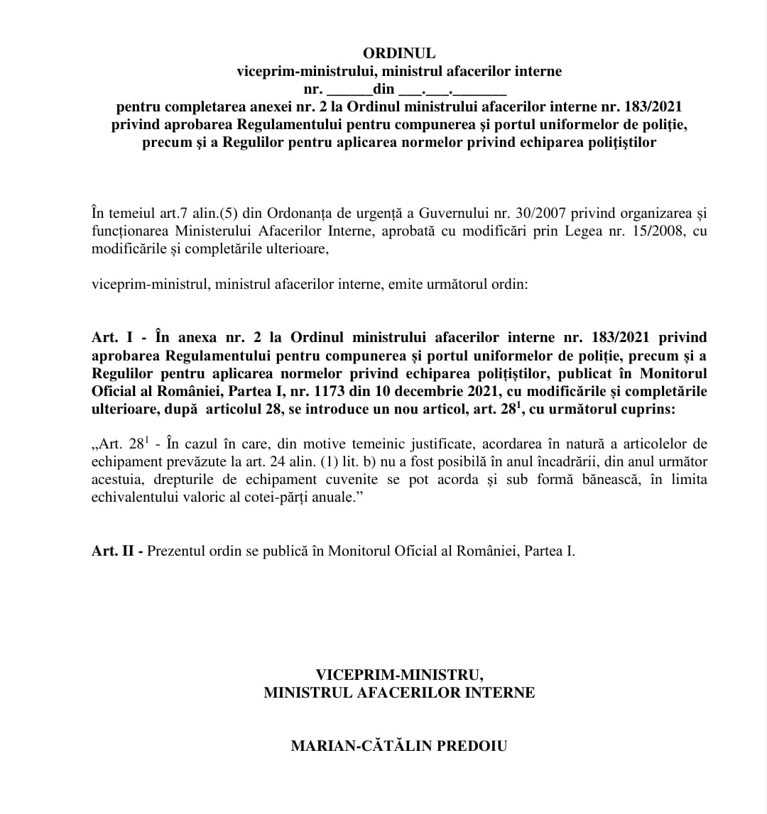 La sediul Ministerului Afacerilor Interne a avut loc ședința Comisiei de Dialog Social ce a avut pe ordinea de zi proiectul pentru modificarea Ordinului ministrului afacerilor interne nr. 183/2021 privind aprobarea Regulamentului pentru compunerea și portul uniformelor de poliție, precum și a Regulilor pentru aplicarea normelor privind echiparea polițiștilor. Ordinul urmează să fie publicat în Monitorul Oficial în perioada imediat următoare și va produce efecte de îndată, dezvaluie sindicatul Europol.