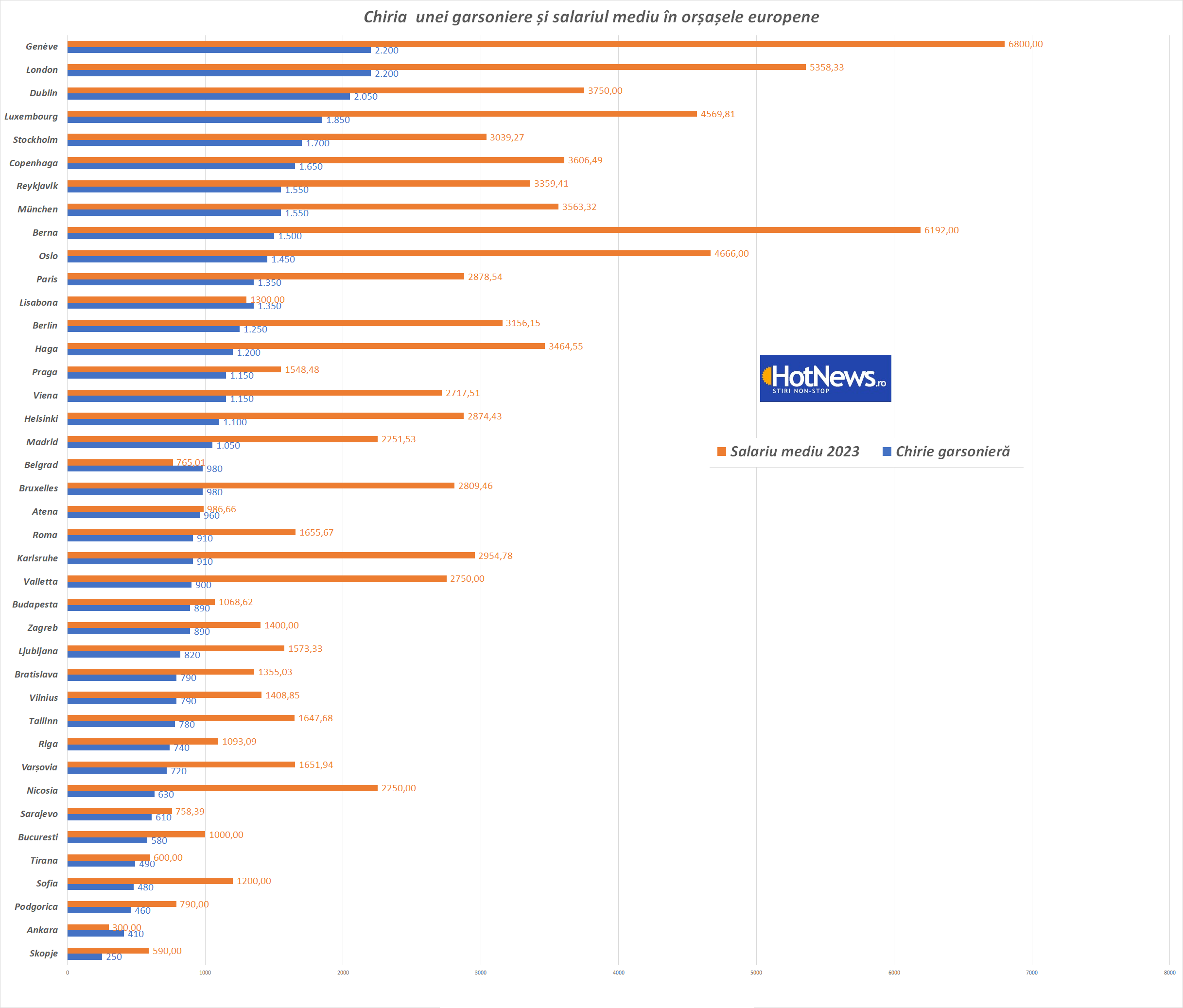 Cifrele sunt publicate în euro pentru coerență și arată că în 3 orașe să închiriezi o garsonieră te costă peste 2000 de euro lunar : Geneva, Londra și Dublin, iar în alte 15 cazuri chiria e între 1000-2000 de euro.