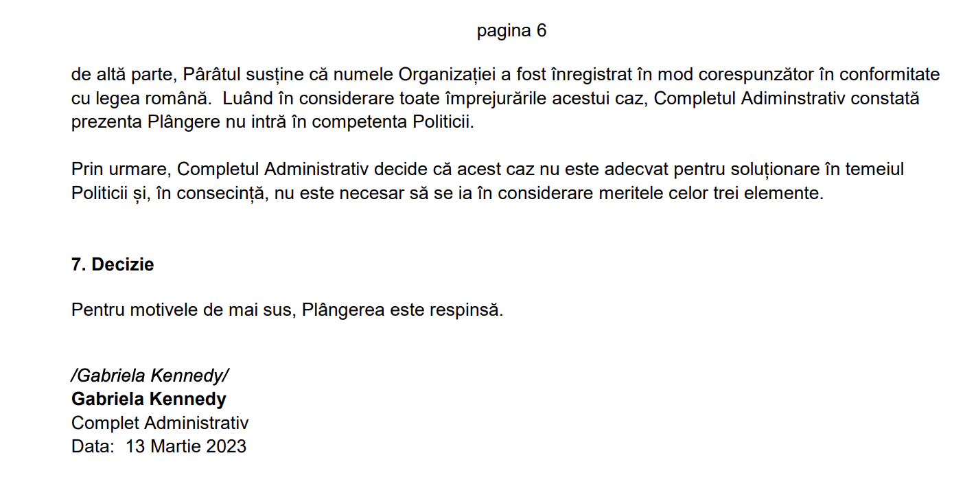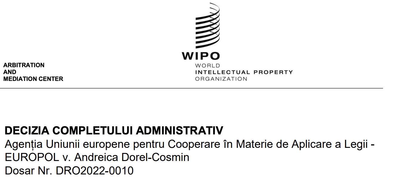 Urmare a răspunsului oferit, firma de avocatură s-a reconfigurat și pe un alt onorariu de mii de euro, în 2023 a deschis o acțiune la Centrul de Arbitraj și Mediere al WIPO (Word International Property Organisation/Organizația Mondială a Proprietății Intelectuale), cea mai importantă agenție internațională specializată în proprietatea intelectuală, și care funcționează pe lângă Națiunile Unite. De această dată, Agenția Europol solicita WIPO să ne deposedeze de domeniul sindicateuropol.ro din cauza riscului de confuzie, criticând gradul de vizibilitate al site-ul pe care îl folosim pentru a asigura informarea asupra activității Sindicatului EUROPOL. Hotărârea completului internațional a fost de respingere a acțiunii firmei de avocatură angajată de Agenția Europol, lipsind orice elemente ce vizează existența unei confuzii în sensul utilizării domeniului sindicateuropol.ro. Am fost plăcut surprinși să constatăm nivelul de înțelegere a problematicii unice ridicate de existența unui situații fără precedent, în care un angajator, Agenția Europol, încearcă să blocheze activitatea unei organizații sindicale.