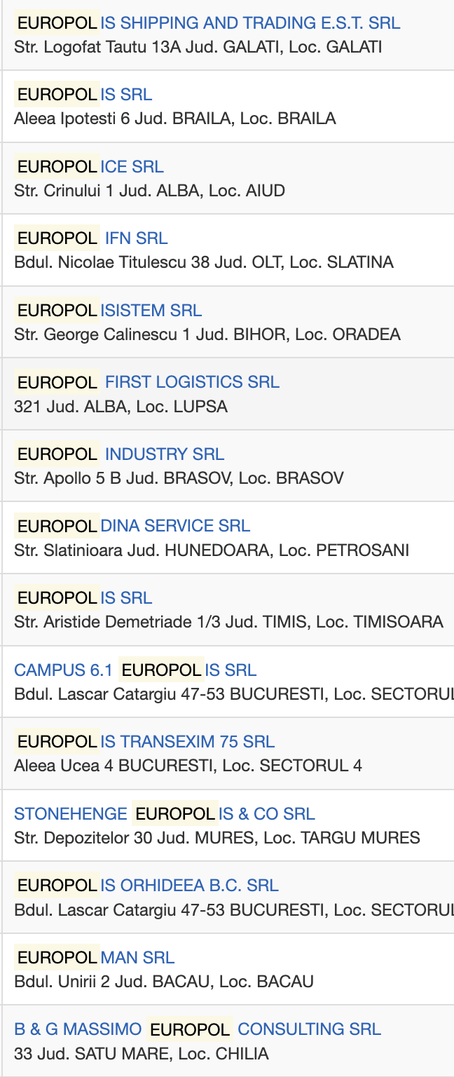Suplimentar, Agenția Europol nu oferă servicii persoanelor fizice ci exclusiv instituțiilor de aplicare a legii din statele membre UE, lipsind astfel orice risc de „confuzie” și „asociere”. Tot în același registru, este interesant că în timp ce noi eram acuzați de folosirea denumirii de „Europol”, care provine din asocierea primelor litere ale cuvintelor „polițiști europeni”, doar în România am identificat peste 60 de firme care realizează activități comerciale având în denumirea lor sintagma „Europol”. La nivel european lucrurile sunt și mai pronunțate, existând sute de societăți precum „Europol Real Estate” sau „Europol Transport”. Împotriva niciuneia dintre aceste entități, Agenția Europol nu a inițiat vreun demers juridic, apreciind că nu îi sunt „lezate” interesele de către aceste entități care desfășoară activitate comercială.