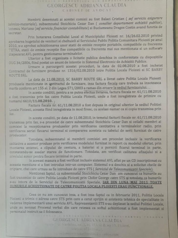 Notă: CHIFOR GEORGE IONUȚ a semnat, totuși două procese verbale de predare primire: Procesul verbal de punere în funcțiune a serviciului de localizare în teren a terminalelor „Tetra” încheiat între Serviciul de Telecomunicații Speciale prin col. VASILE MARIAN (nr. 630604/06.05.2011) și Poliția Locală Ploieșți, prin CHIFOR GEORGE (nr. 1552/10.05.2011) și Procesul verbal de punere în funcțiune a serviciului de comunicații de buclă locală pentru aplicația de management a serviciului AVL încheiat între aceleași instituții prin CRIȘU SEBASTIAN de la STS (nr. 630580/29.04.2011), respectiv nr. 1480/05.05.2011 la Poliția Locală Ploieșți, prin CHIFOR GEORGE.